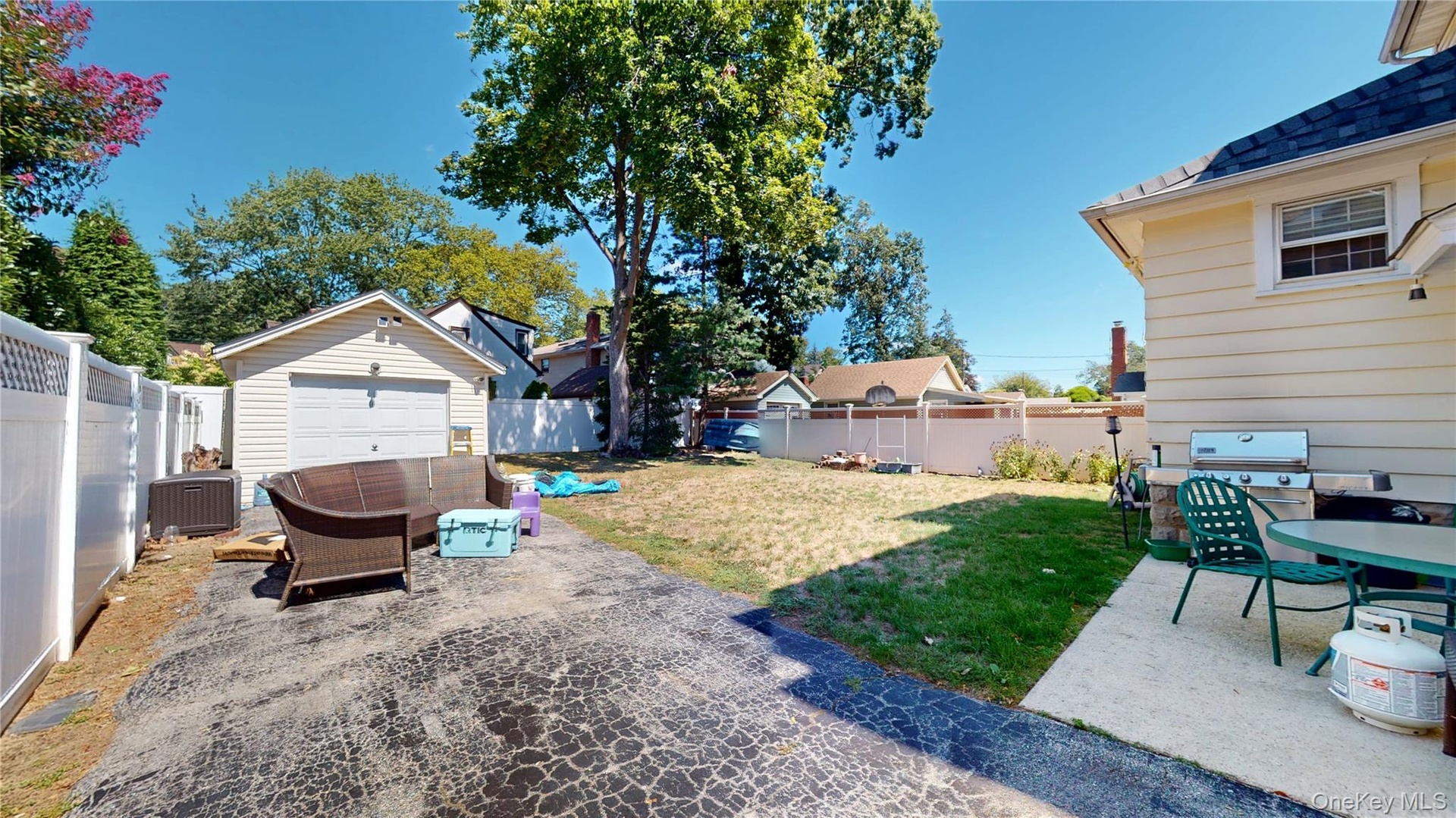 - Fenced backyard with a patio area, a detached garage, an outdoor structure, and driveway