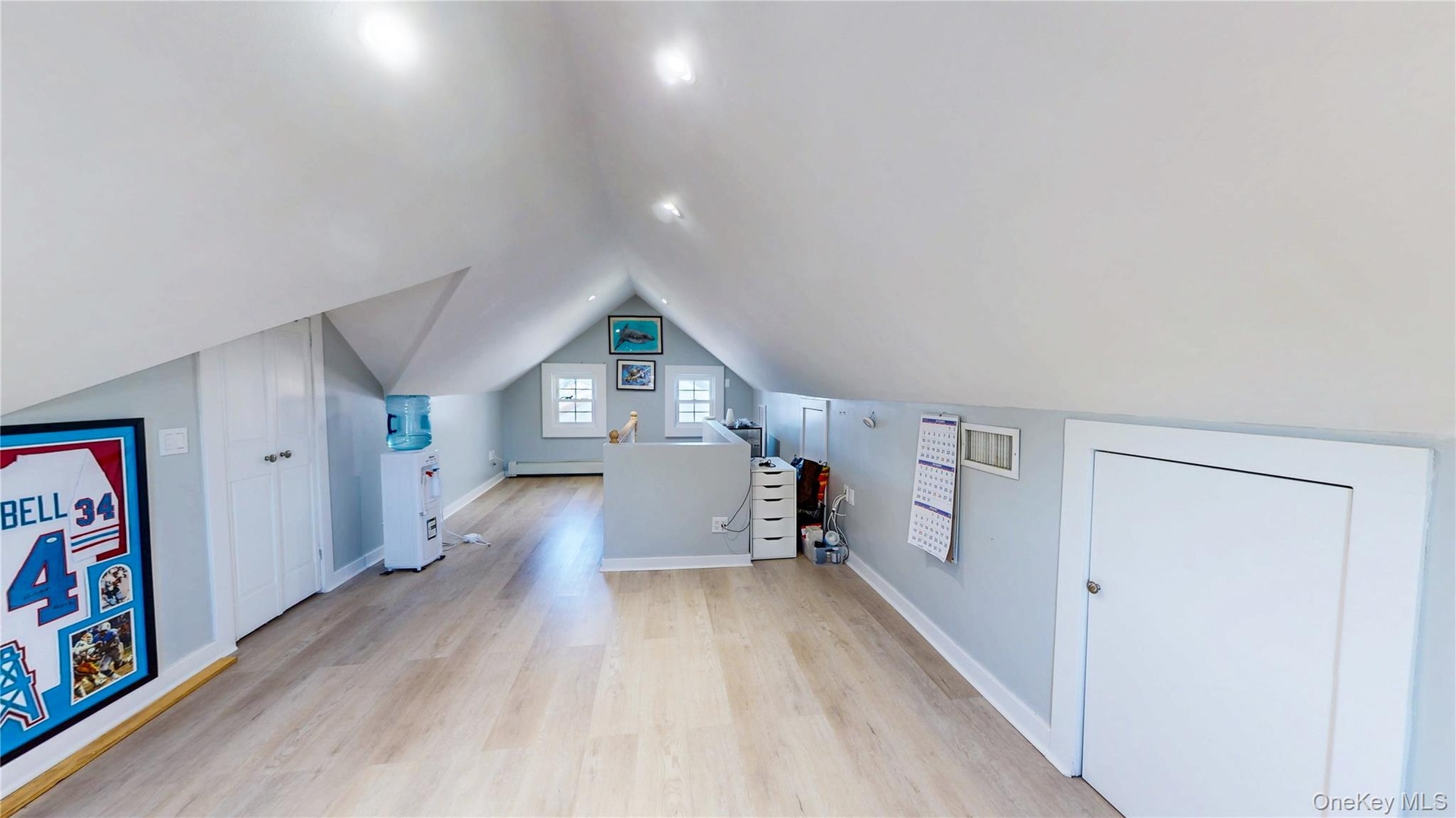 - Bonus room featuring light wood-style floors, lofted ceiling, and baseboard heating