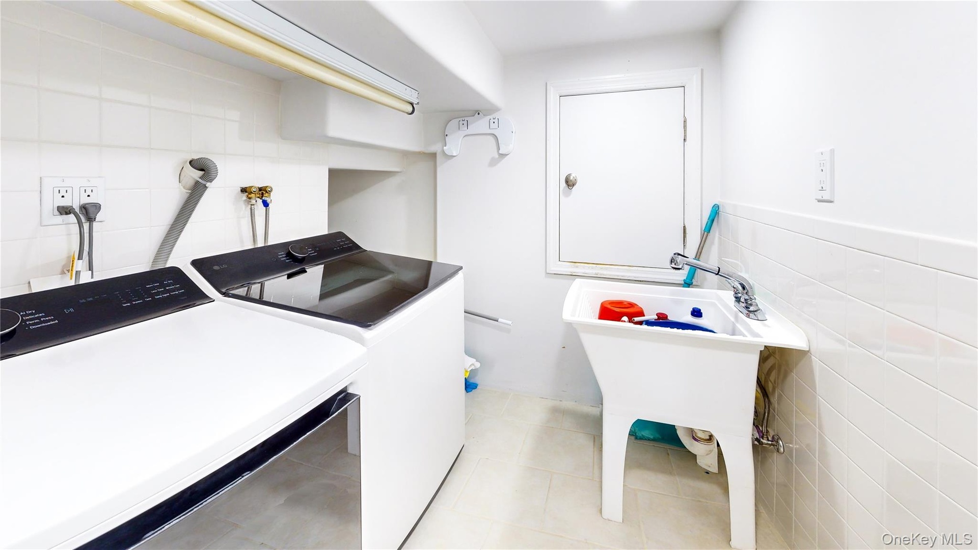 - Laundry area featuring tile walls, light tile patterned floors, and washing machine and clothes dryer
