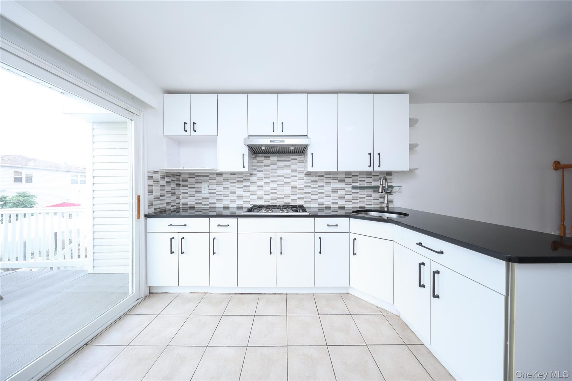 - Kitchen with decorative backsplash, a peninsula, white cabinets, light tile patterned floors, and under cabinet range hood