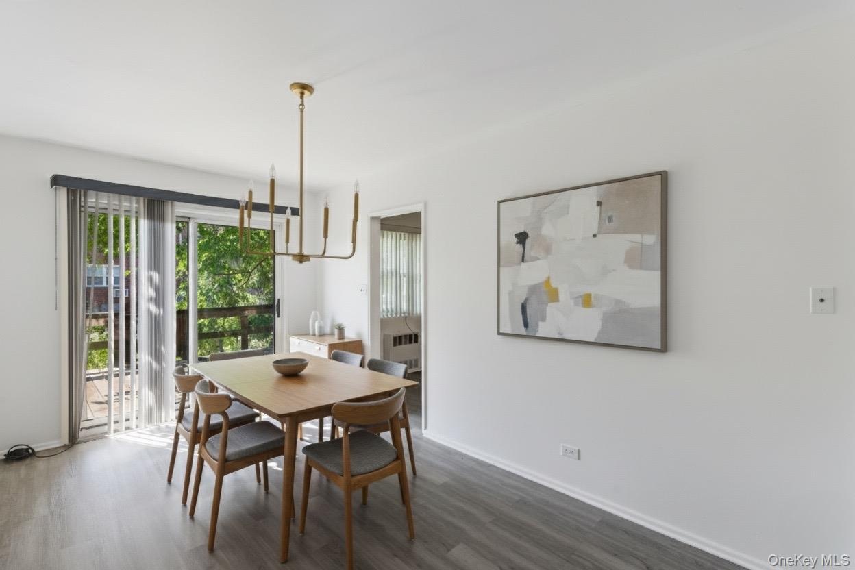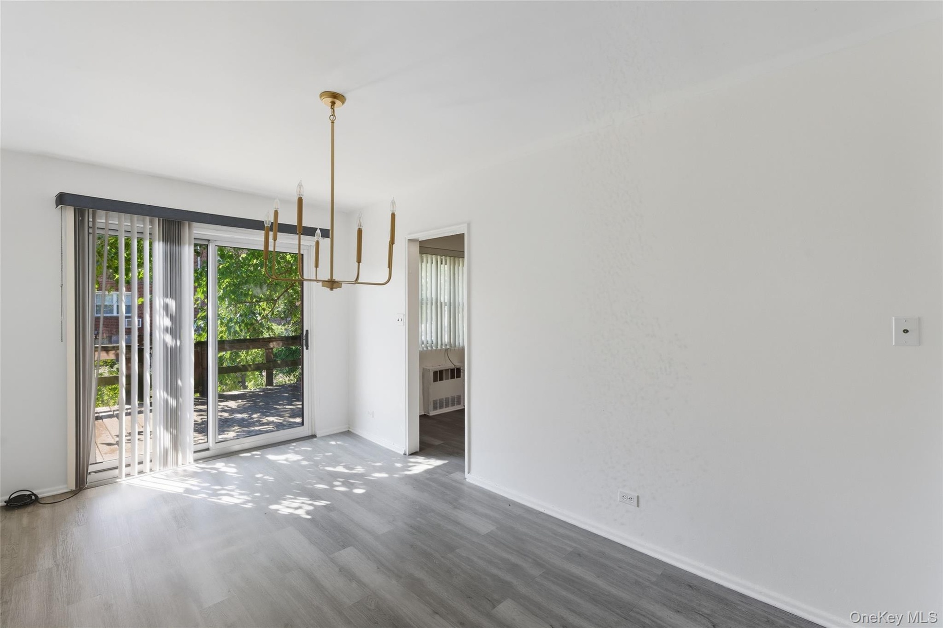 - Unfurnished dining area featuring wood finished floors and radiator heating unit