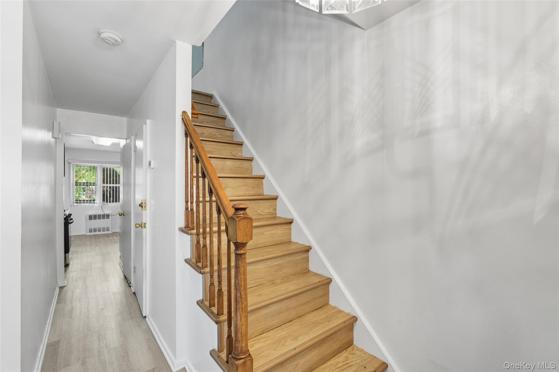 - Hallway featuring light wood-type flooring, an upstairs landing, radiator heating unit, and a chandelier