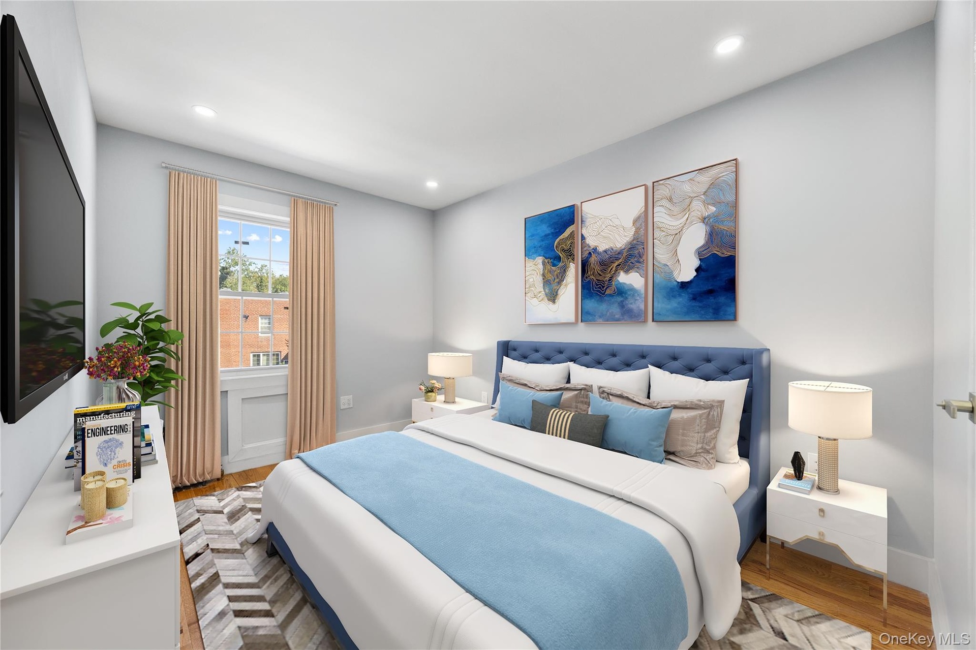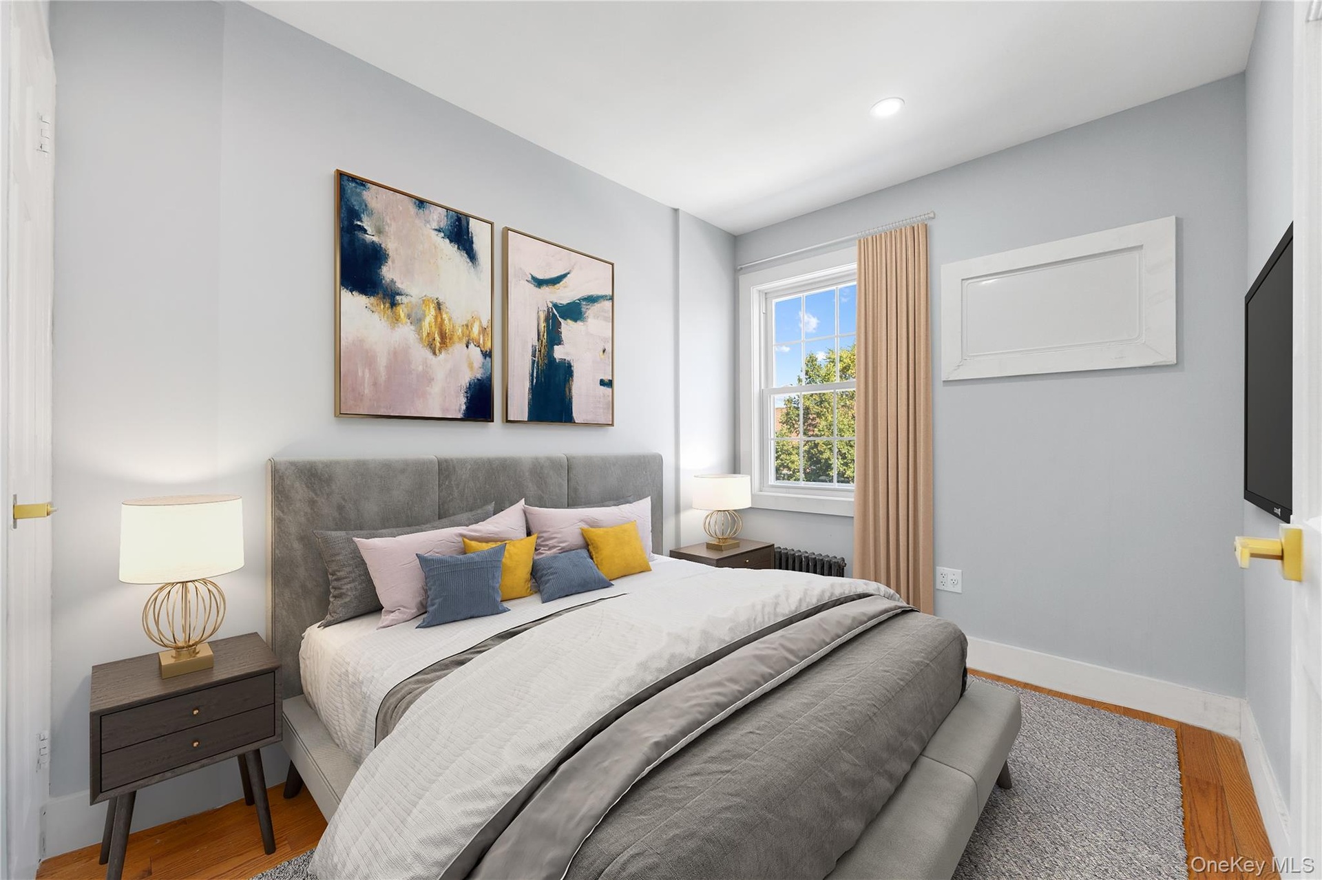 - Bedroom with wood finished floors, recessed lighting, and radiator