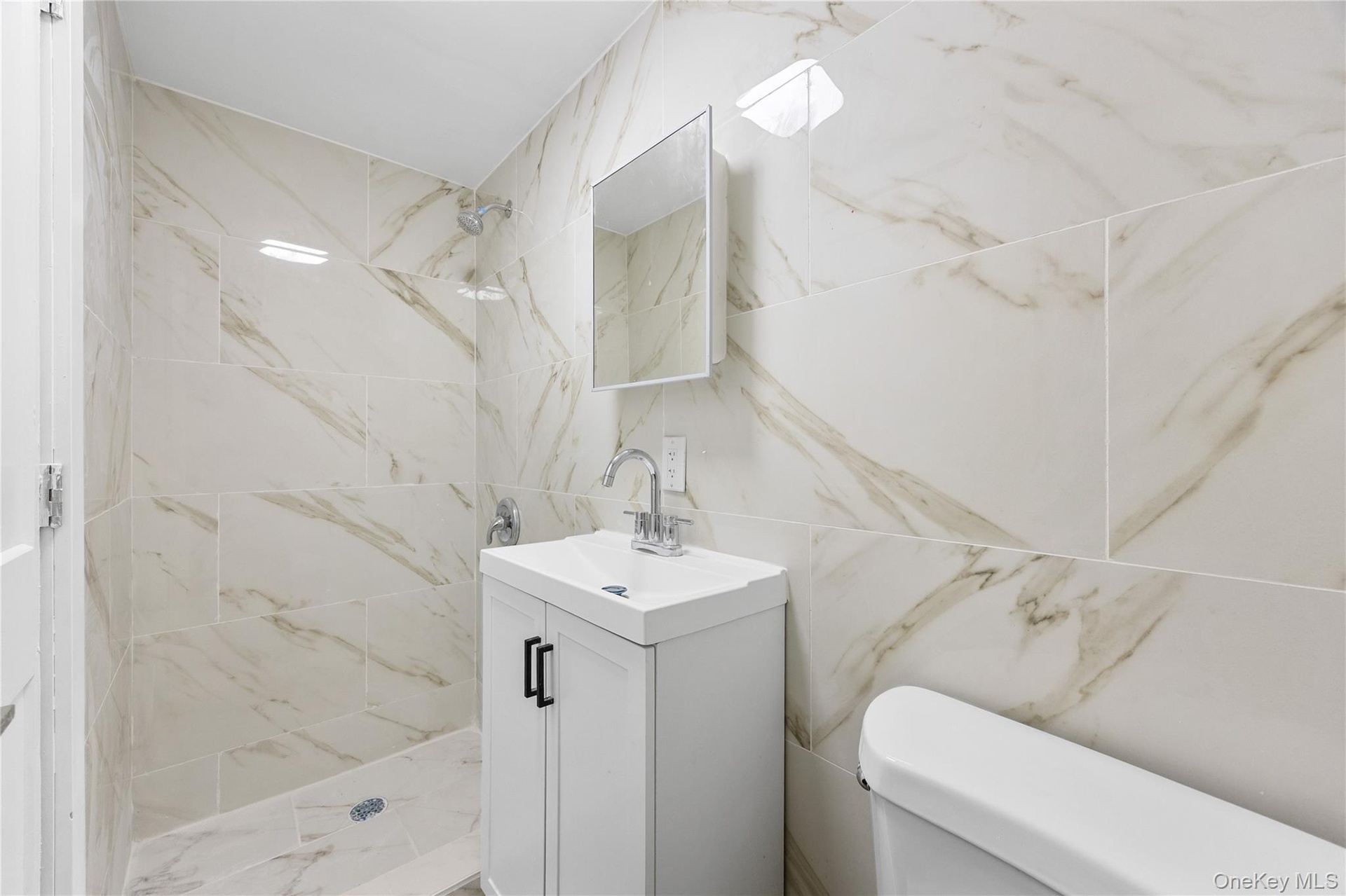 - Bathroom featuring tile walls, vanity, and decorative backsplash