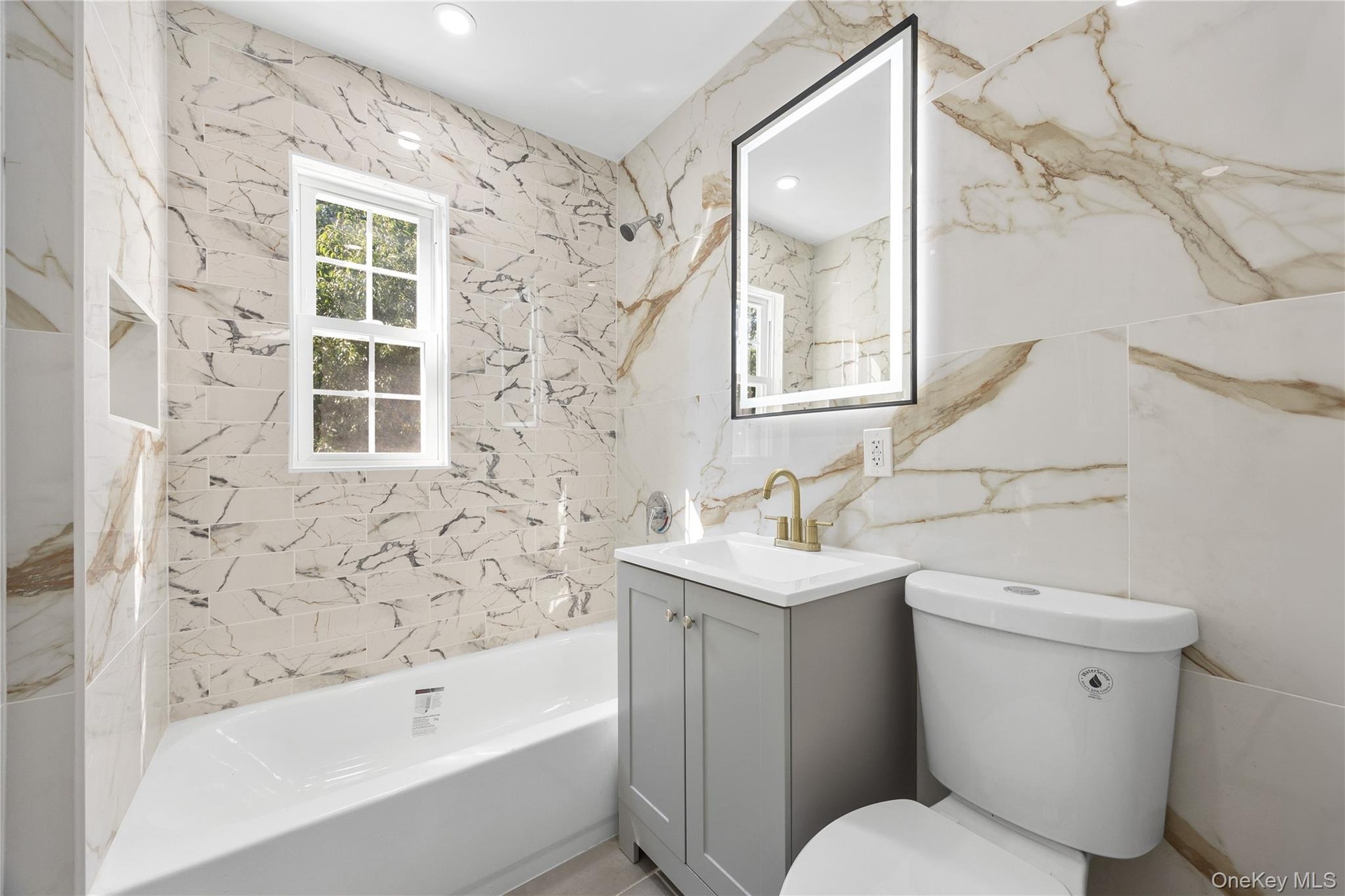 - Bathroom with shower / bathtub combination, vanity, recessed lighting, tile walls, and stone wall