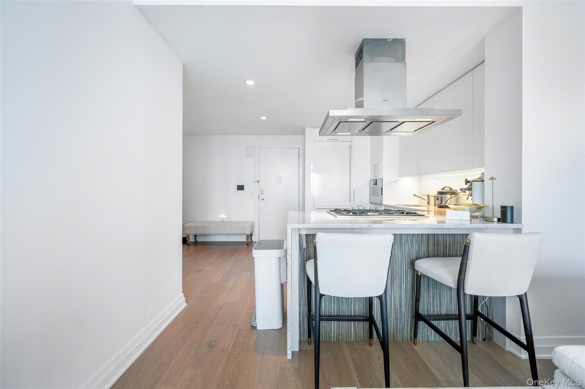 - Hall with light wood finished floors and recessed lighting