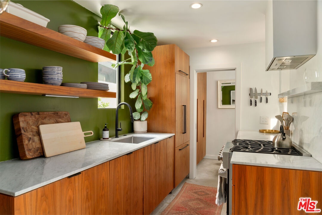 Design lovers take note: this 1948 residence by celebrated Mid-Century architect Cliff May was recently taken down to the studs and re-envisioned from the original structure with contemporary updates. Behind a private courtyard, walls of glass frame the interiors and blur the line between indoor and outdoor living. Natural light pours through skylights and oversized windows, highlighting polished concrete floors and the home's open, airy layout. The kitchen is a showcase of modern function and style with marble countertops, custom cabinetry, high-end appliances, and integrated dining. Both bathrooms feature artisan tile and refined fixtures, while the primary suite offers a spa-like bath and direct access to a secluded bistro patio. A generous walk-in closet completes this retreat. Multiple patios and decks extend the living space outdoors and invite you to relax in the sun, entertain guests, or enjoy serene canyon vistas. A mobile vintage orb fireplace adds character and flexibility. A two car garage provides off-street parking along with extra storage space. Fantastic Beverly Glen location close to nature, trails and amenities. Take a stroll up to your local Glen Market or take advantage of your proximity to Westwood and the coveted Glen Centre. A timeless piece of architectural history, beautifully renewed for today's lifestyle.