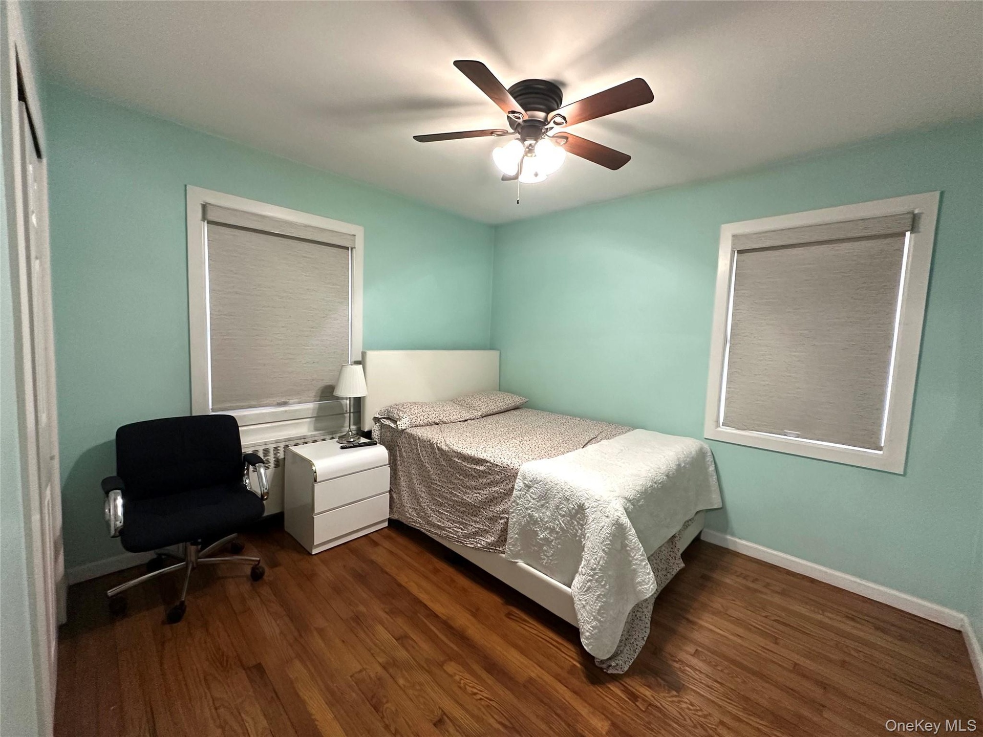 - Bedroom featuring wood-type flooring, radiator heating unit, and ceiling fan