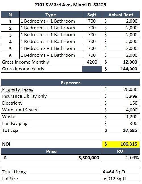T6-8-O-URBAN CORE ZONE. You can build a mixed use high rise building of 8 floors. First floor for commercial retail or office. second and third floors for 33 parking spaces. 5 next floors for residences 5 units per floor.Amazing corner lot location to develop get income as you submit permits. Gross income $144,000. 40 year recertification was passed in 2022. Flat roof replaced in 2019. Very low liability insurance $4,000 a year. Building consist of 6 one bedrooms one bathroom of 700 Sf each rented at $2,000.