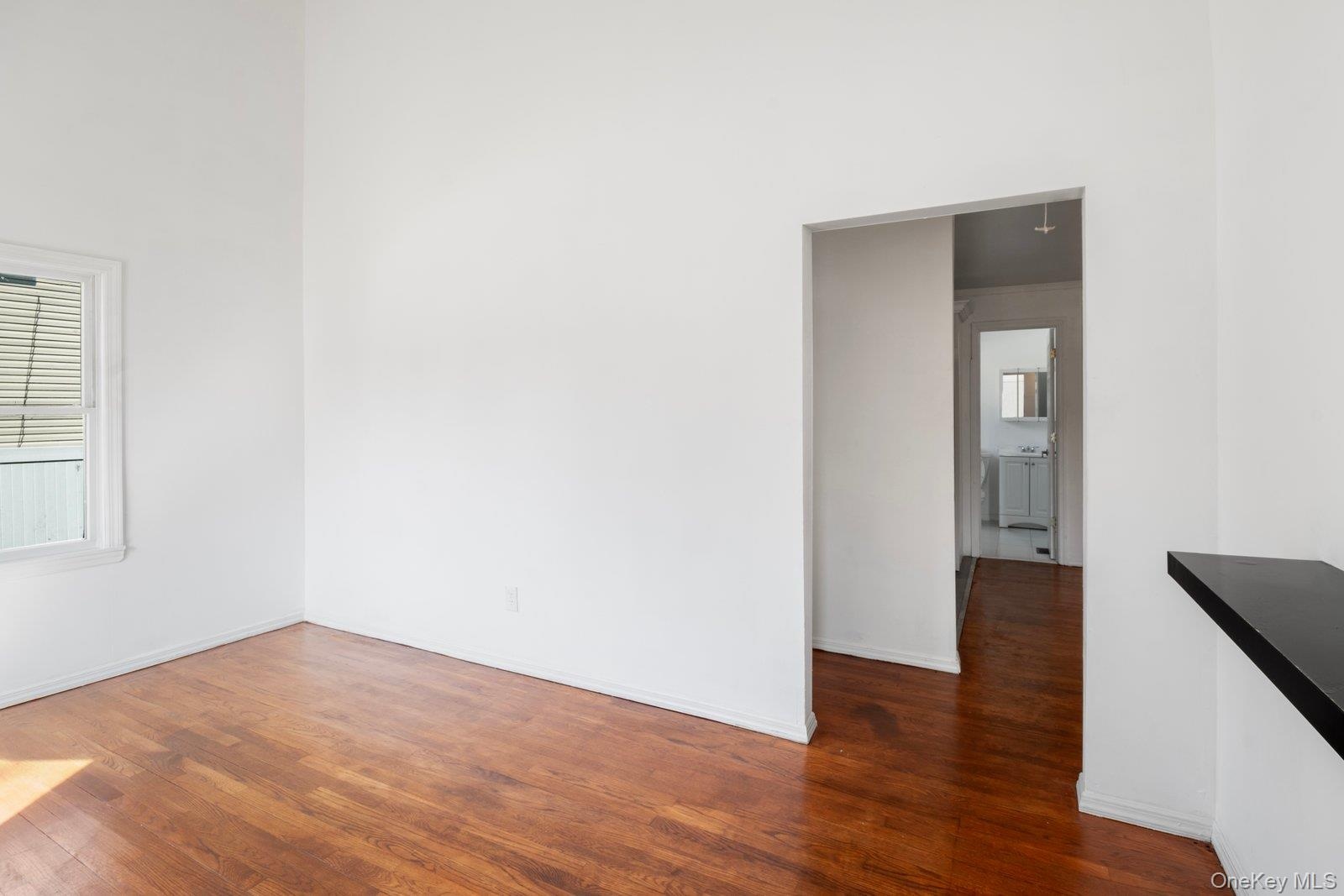 - Empty room with dark wood-style floors and baseboards