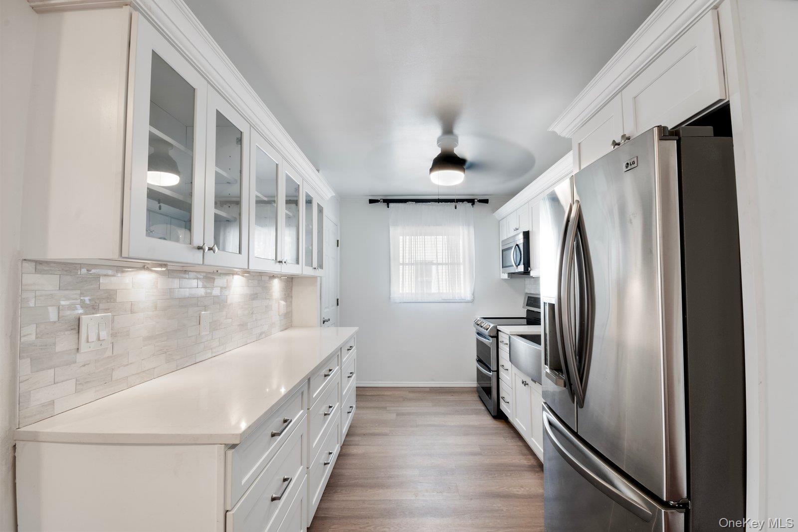 - Kitchen with appliances with stainless steel finishes, glass insert cabinets, white cabinetry, tasteful backsplash, and dark wood-style flooring