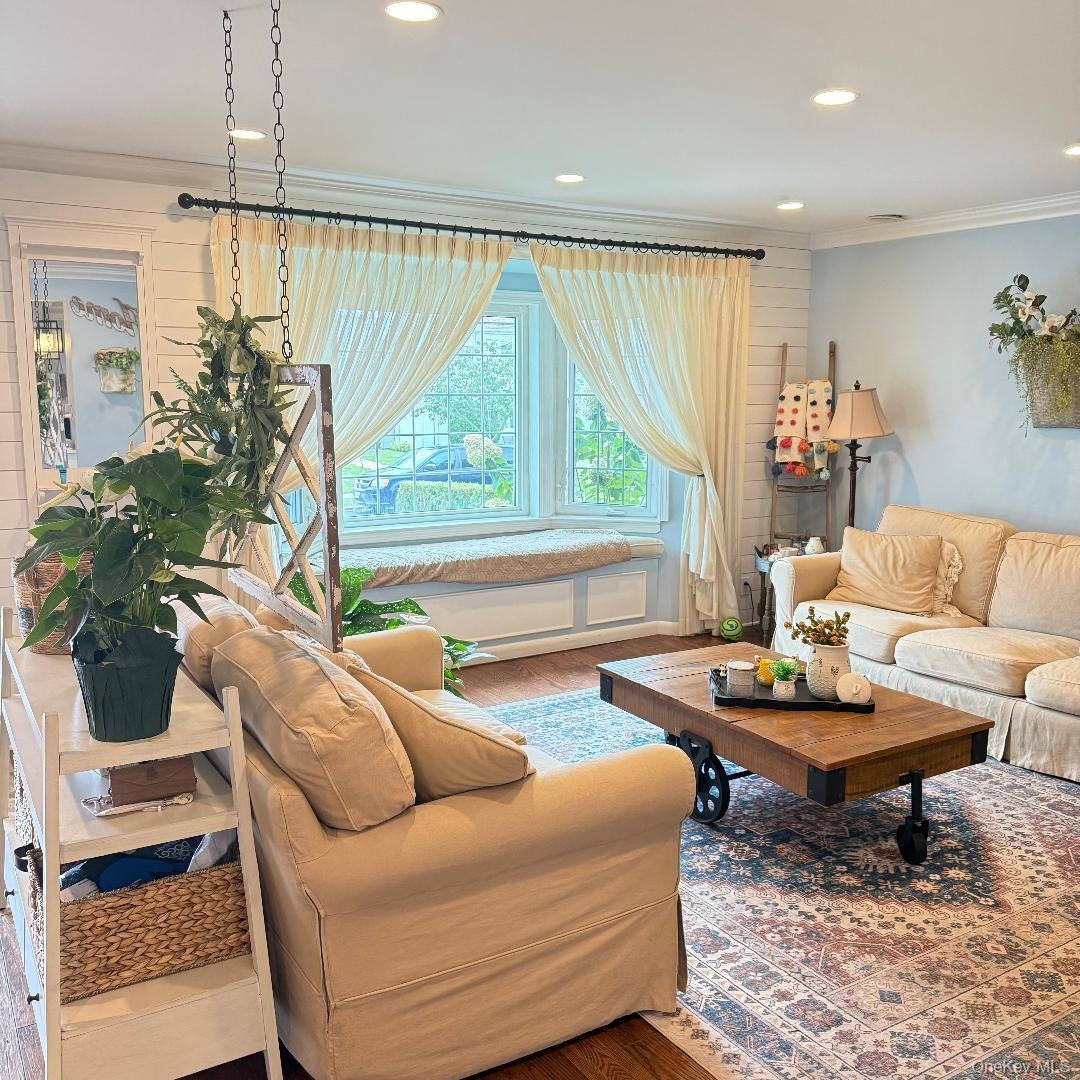 - Living room with wood finished floors, ornamental molding, and recessed lighting