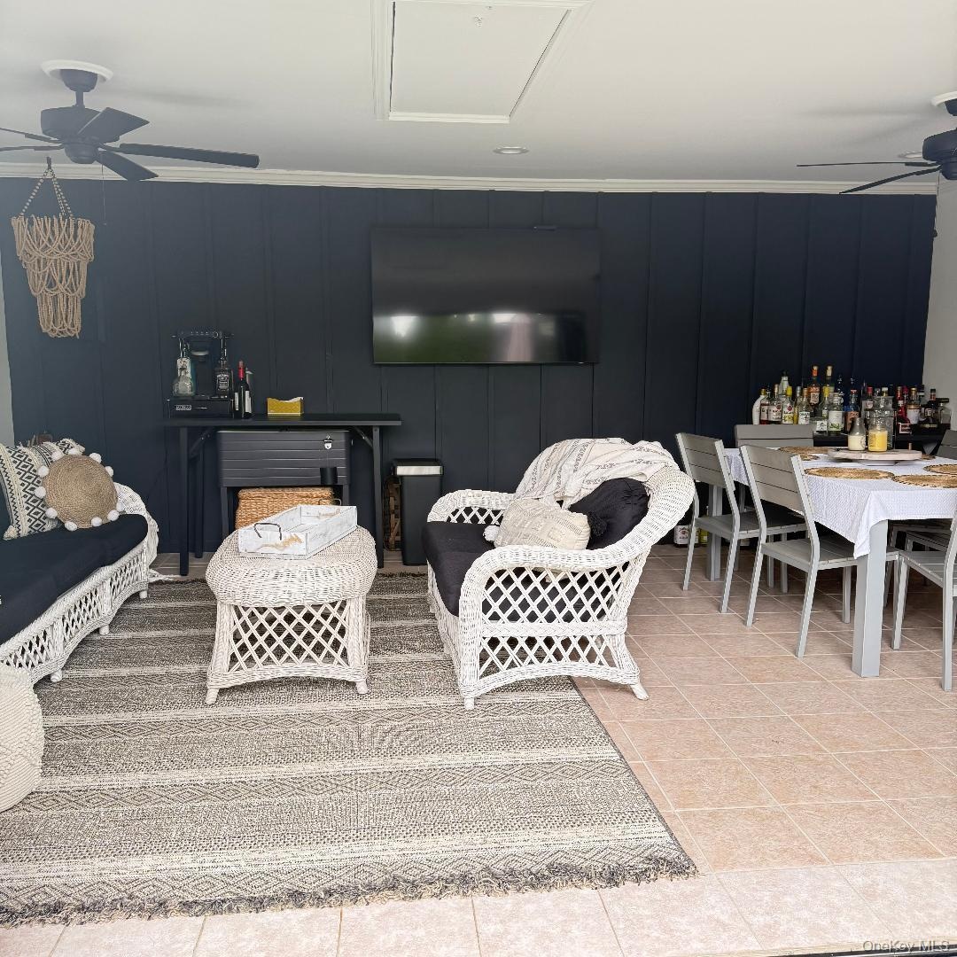 - Playroom with ceiling fan, light tile patterned flooring, a decorative wall, and crown molding