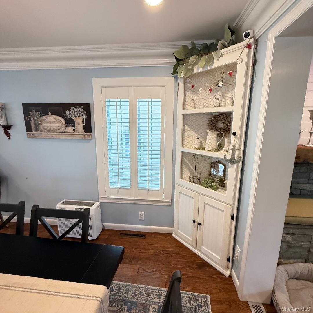 - Living area with crown molding, wood finished floors, and recessed lighting