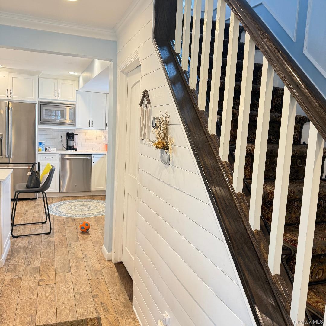 - Staircase featuring wood finished floors, crown molding, and recessed lighting