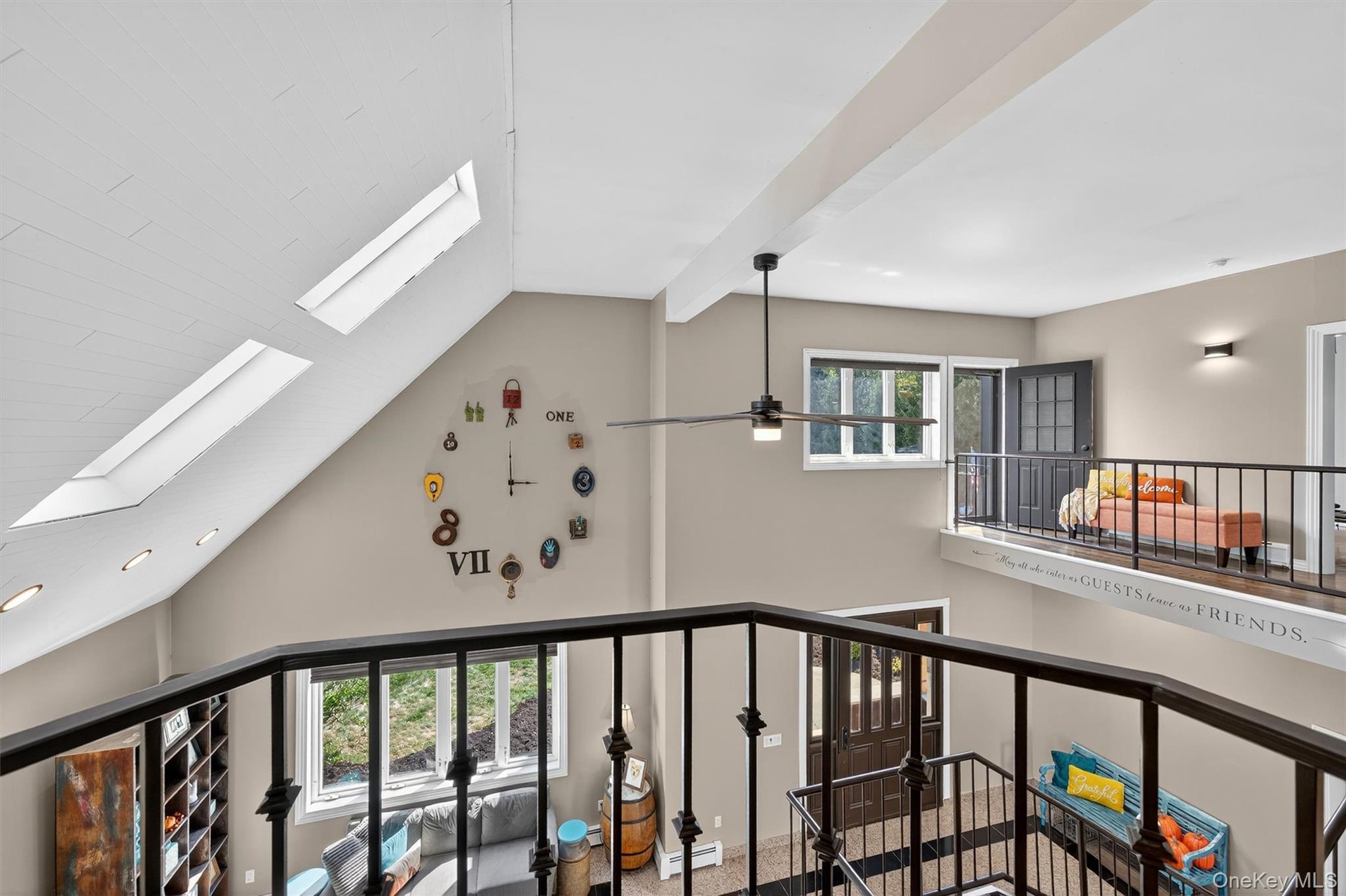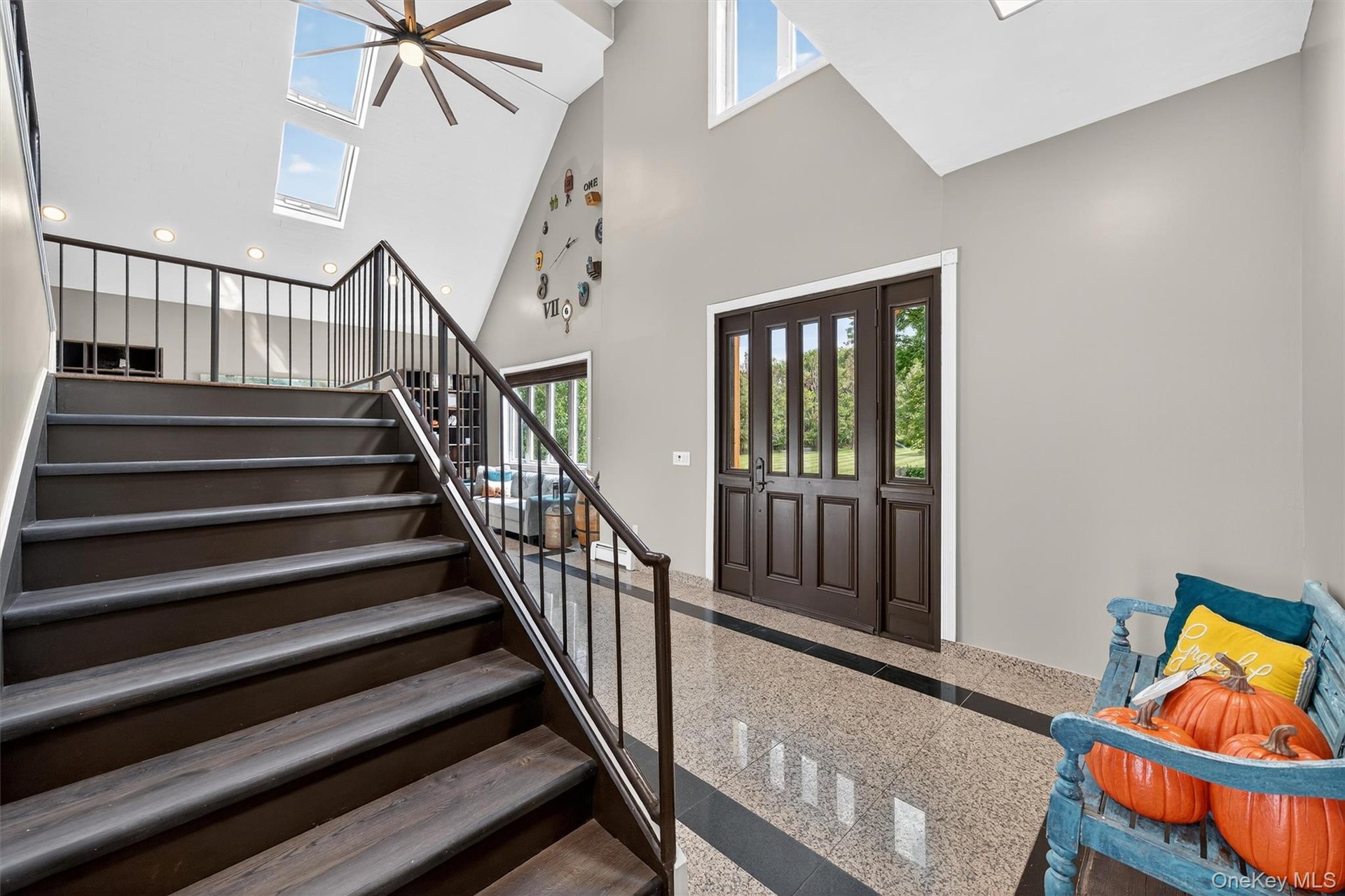 - Entryway with a high ceiling, a skylight, a ceiling fan, and stairway