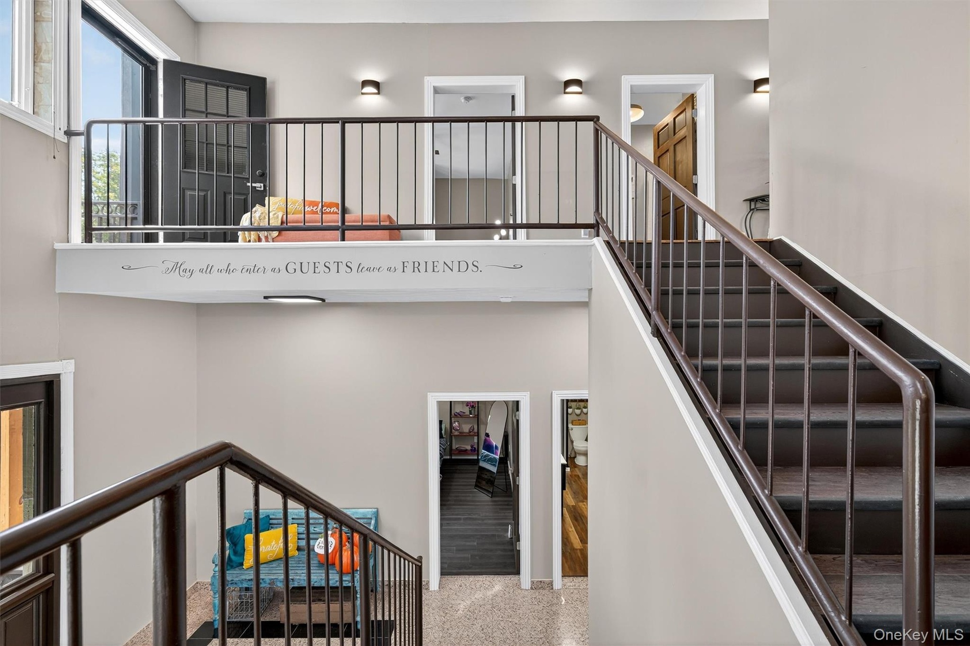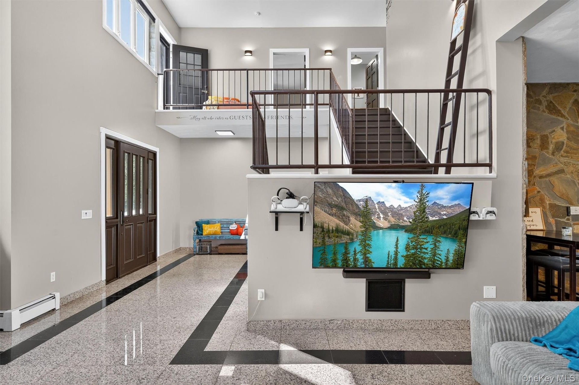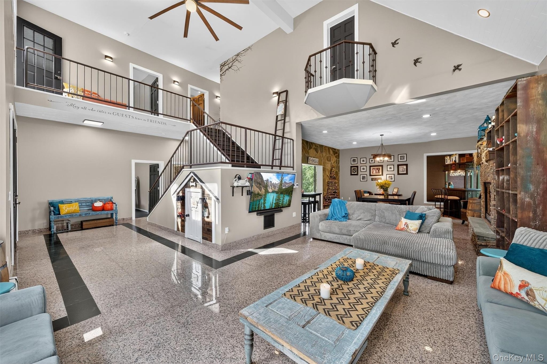 - Living area featuring a towering ceiling, beam ceiling, stairs, and granite floors