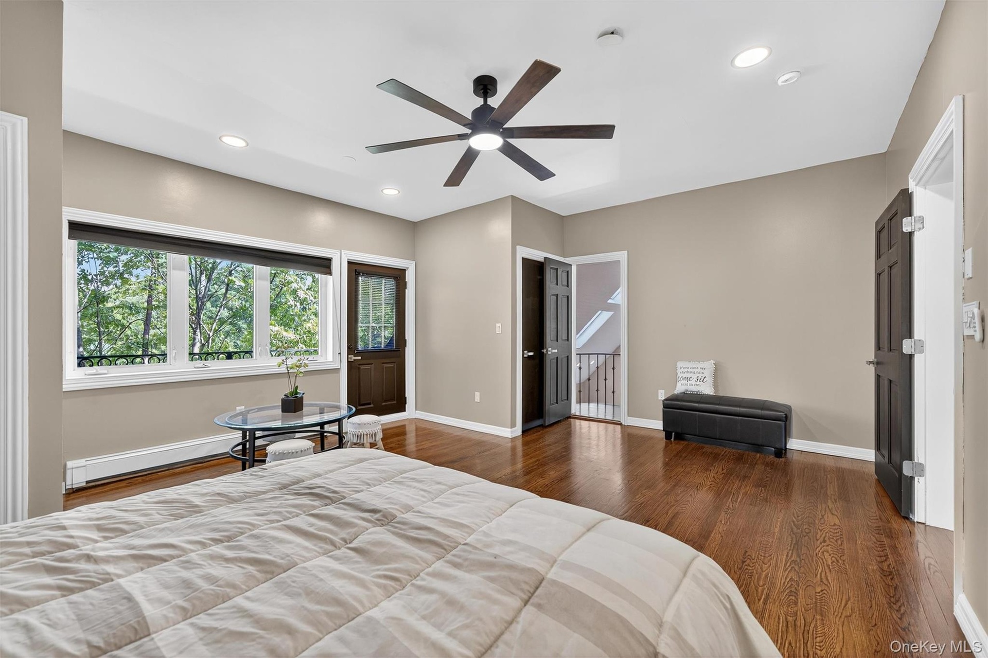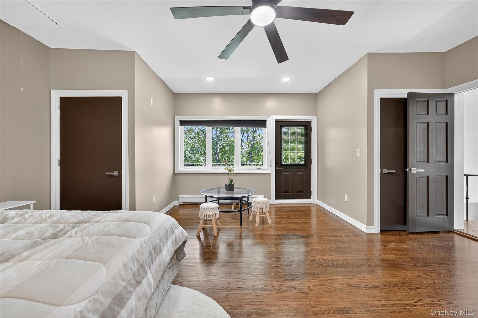 - Bedroom featuring wood finished floors, recessed lighting, attic access, a ceiling fan, and a baseboard heating unit