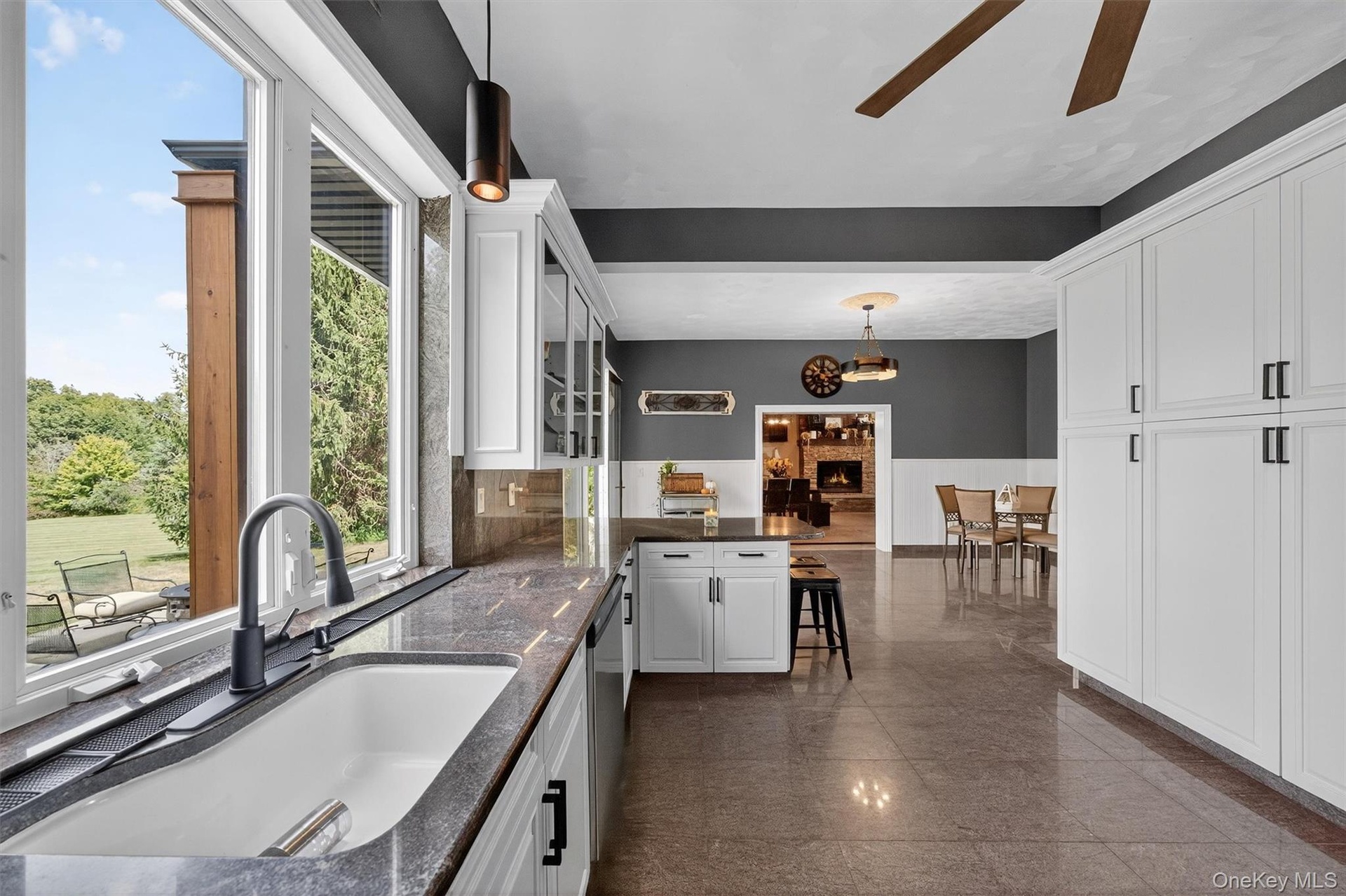 - Kitchen with a peninsula, white cabinets, decorative light fixtures, dark stone countertops, and a wainscoted wall