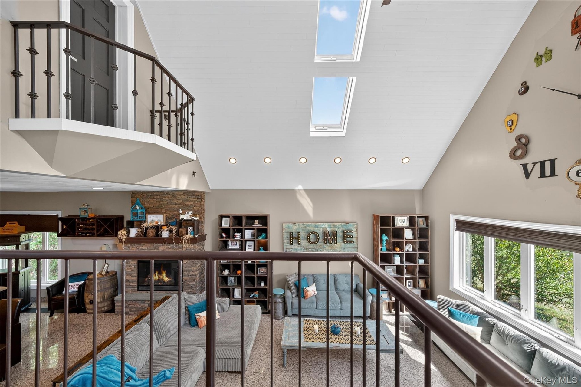 - Corridor featuring a skylight, high vaulted ceiling, and carpet flooring