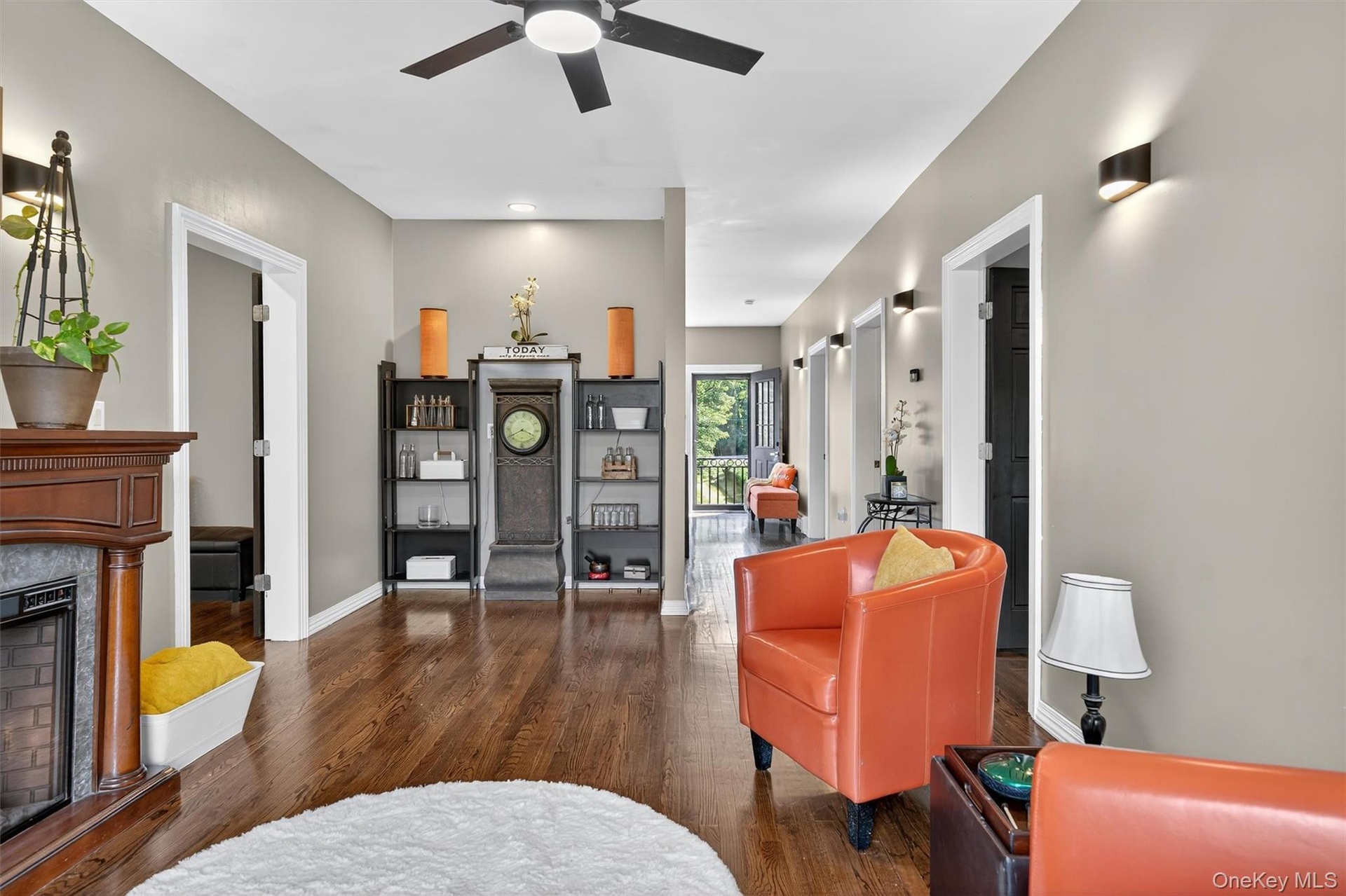 - Sitting room featuring a high end fireplace, dark wood-type flooring, and ceiling fan