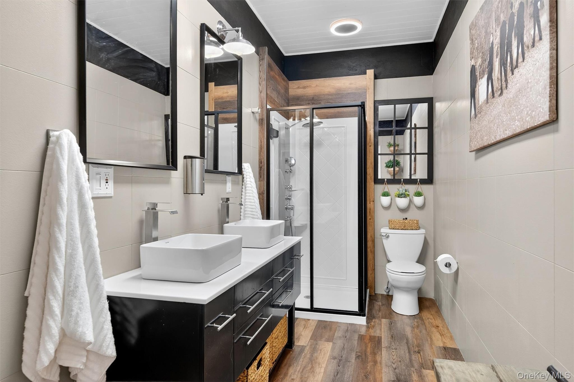 - Full bath with dark wood-style flooring, double vanity, a shower stall, and tile walls