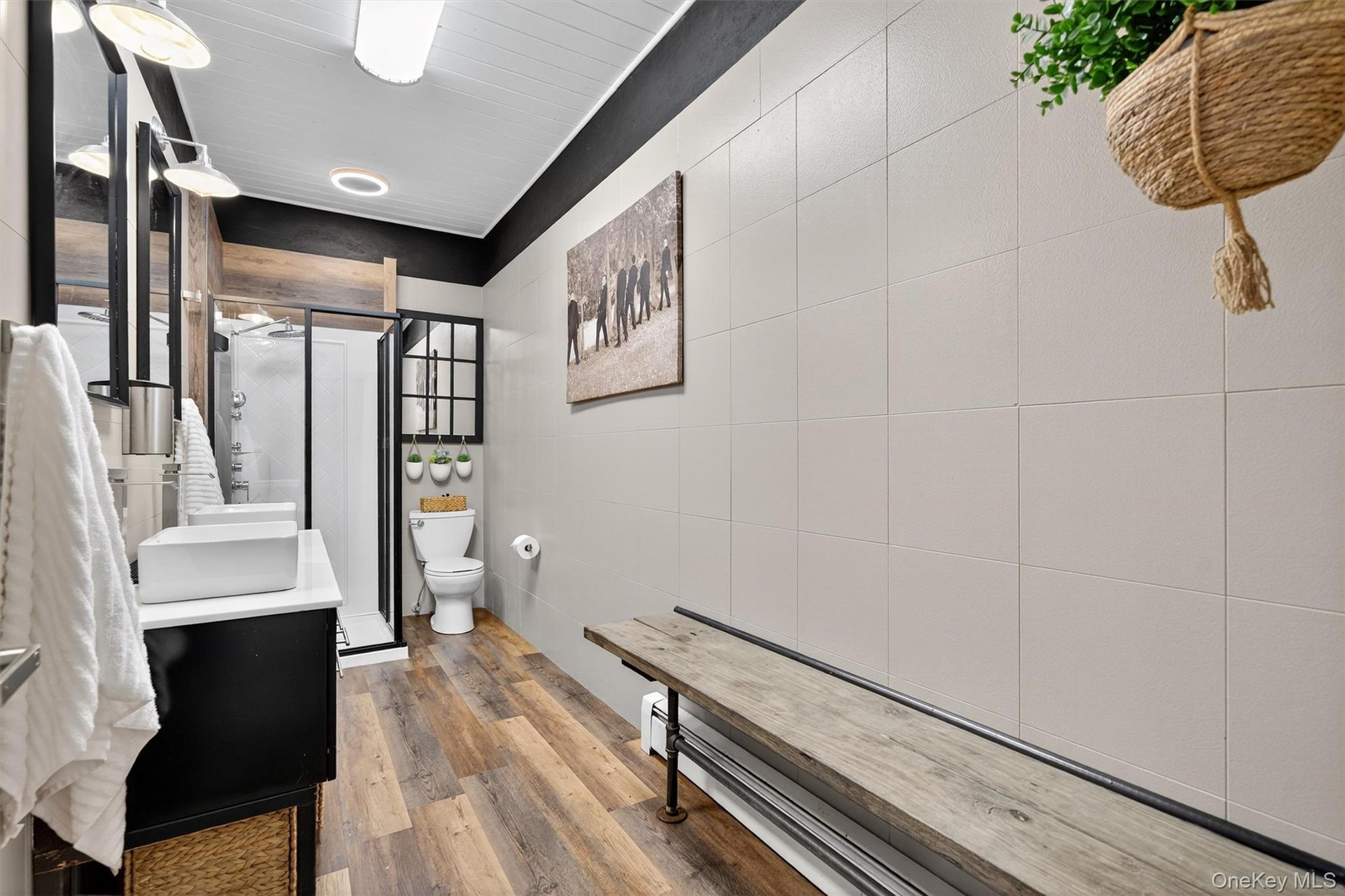 - Full bath featuring a stall shower, light wood-style floors, vanity, tile walls, and baseboard heating