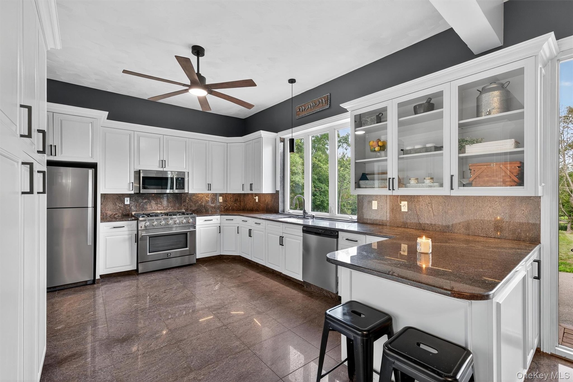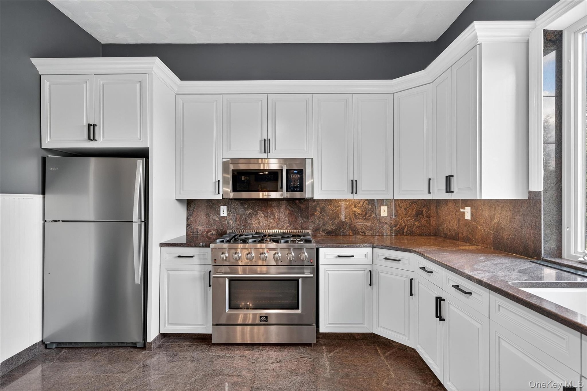 - Kitchen featuring granite floors, white cabinets, backsplash, appliances with stainless steel finishes, and dark stone counters