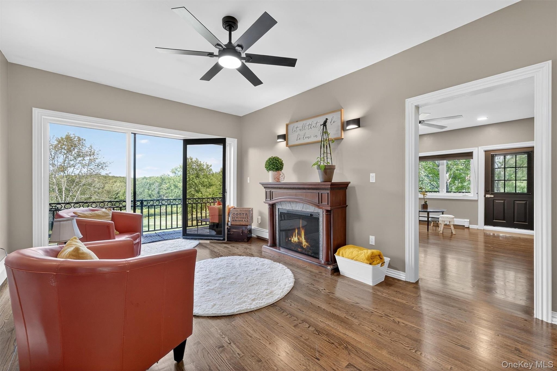 - Living room featuring ceiling fan, wood finished floors, and a glass covered fireplace