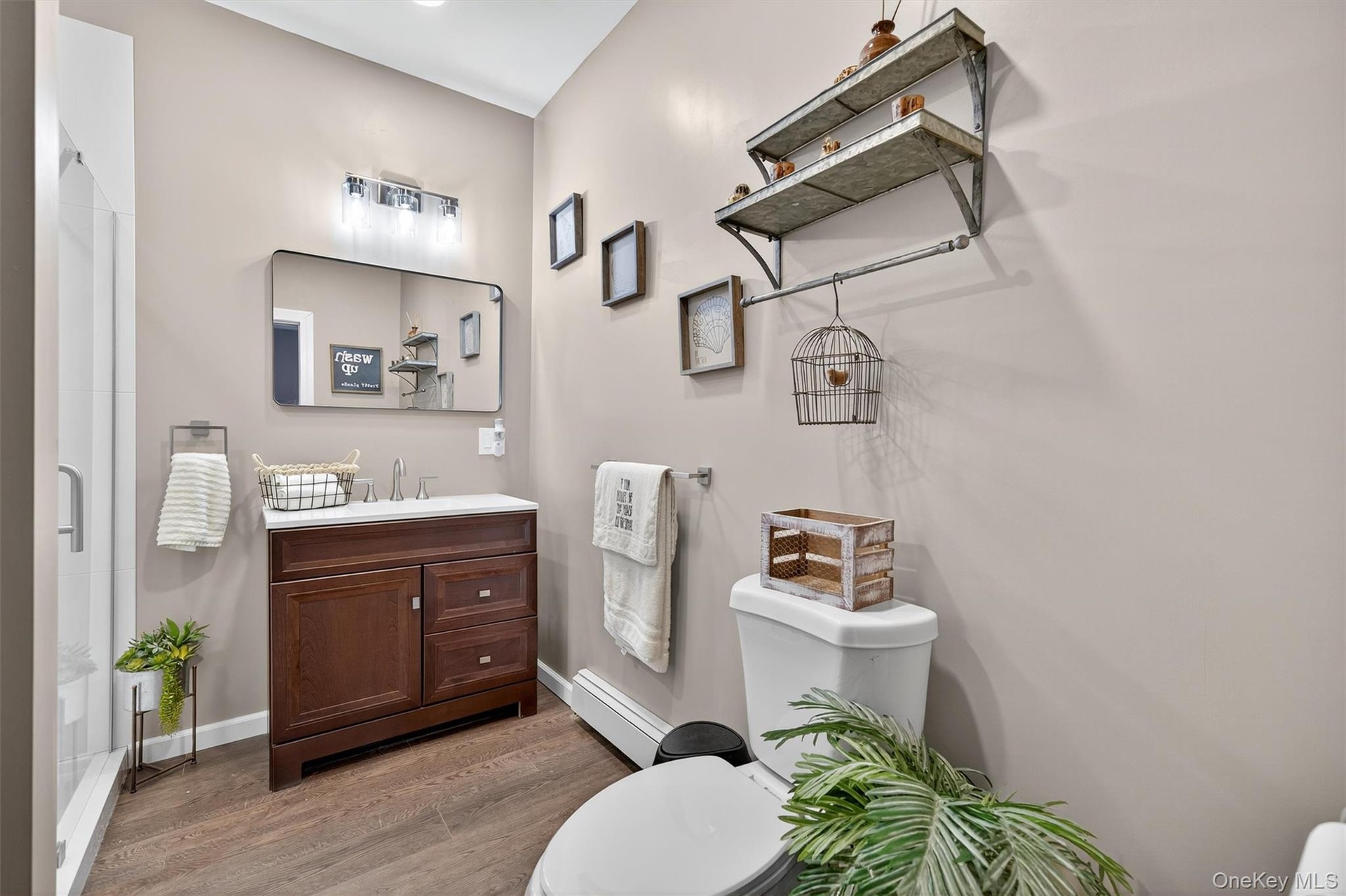 - Full bath with vanity, light wood-style floors, baseboard heating, and a shower stall