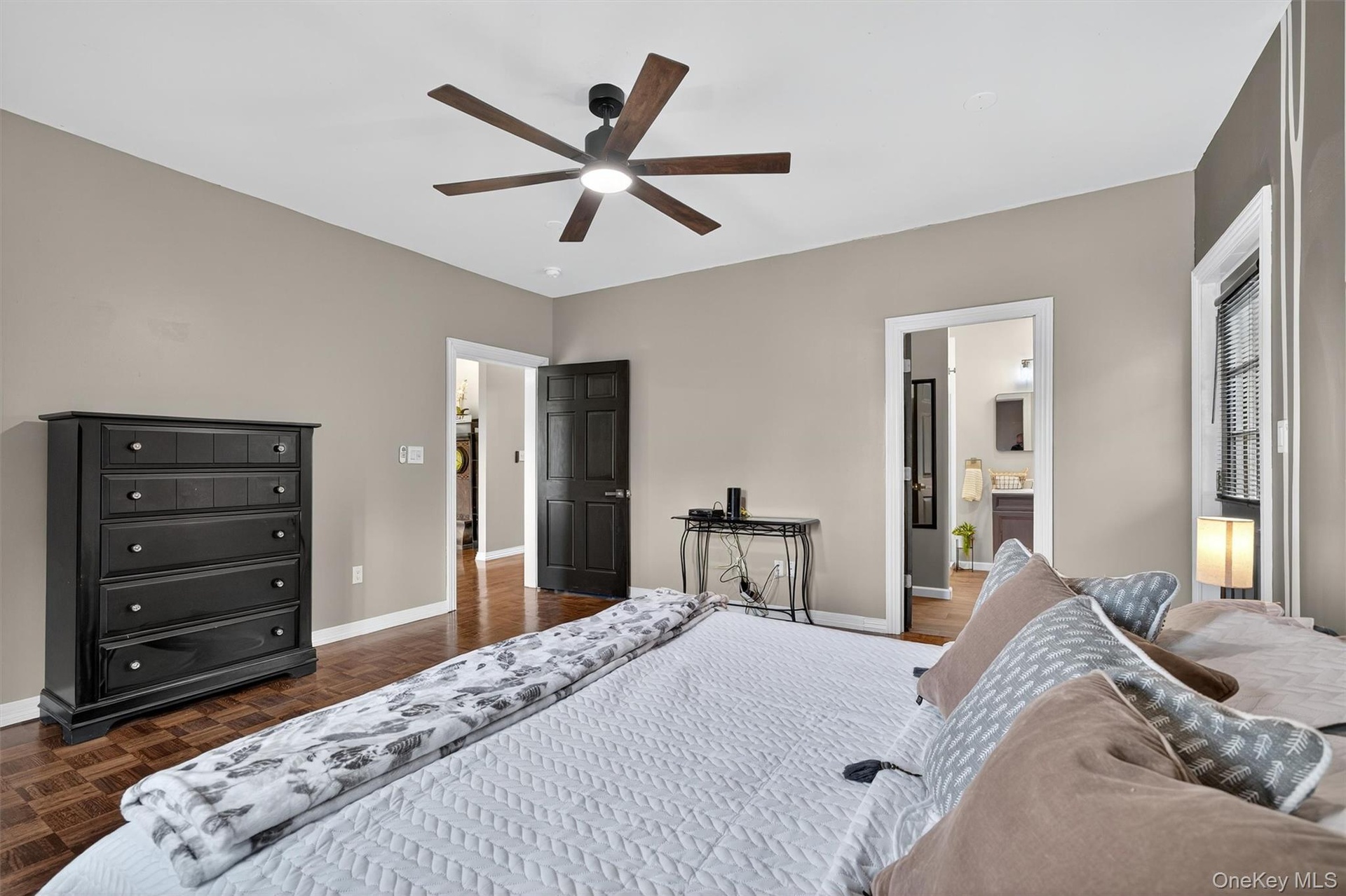- Bedroom featuring ceiling fan and ensuite bathroom