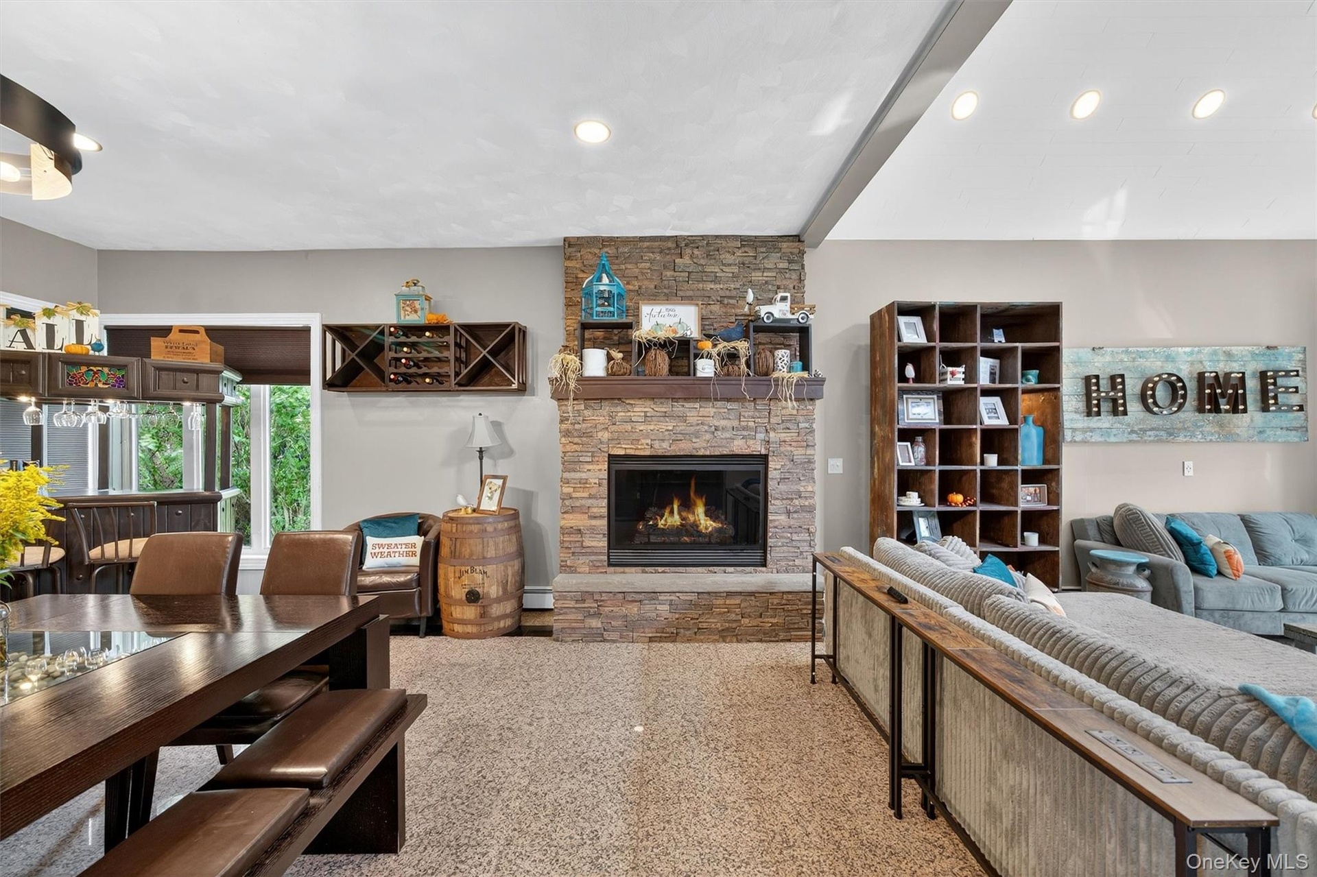 - Living area featuring a stone fireplace, recessed lighting, and speckle patterned floor