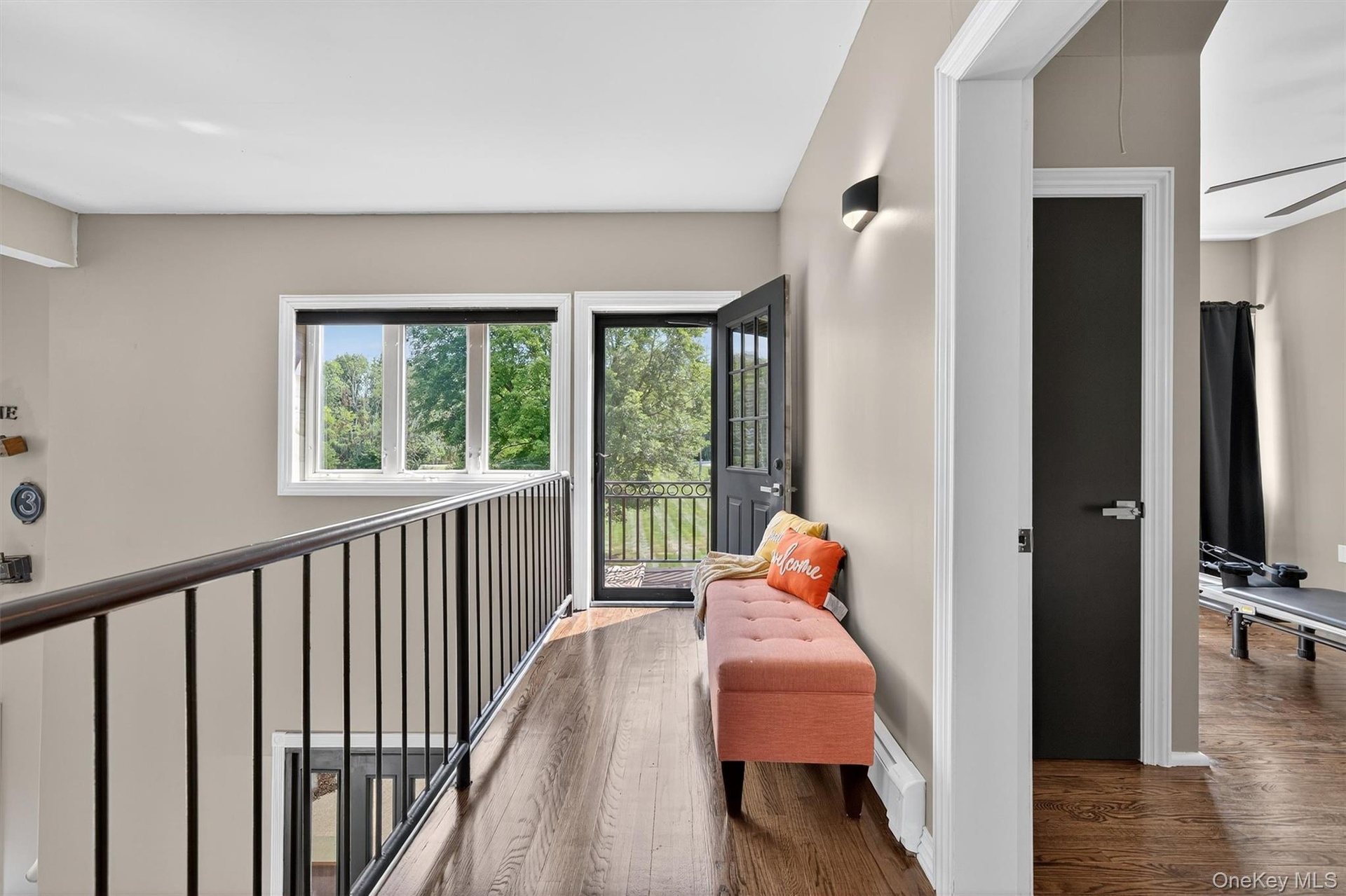 - Living area featuring wood finished floors, attic access, and baseboard heating