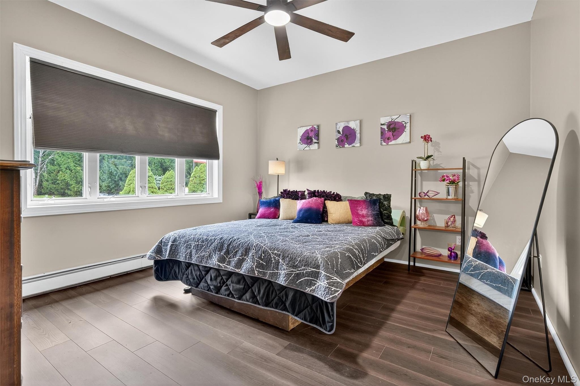 - Bedroom with baseboard heating, wood finished floors, and ceiling fan
