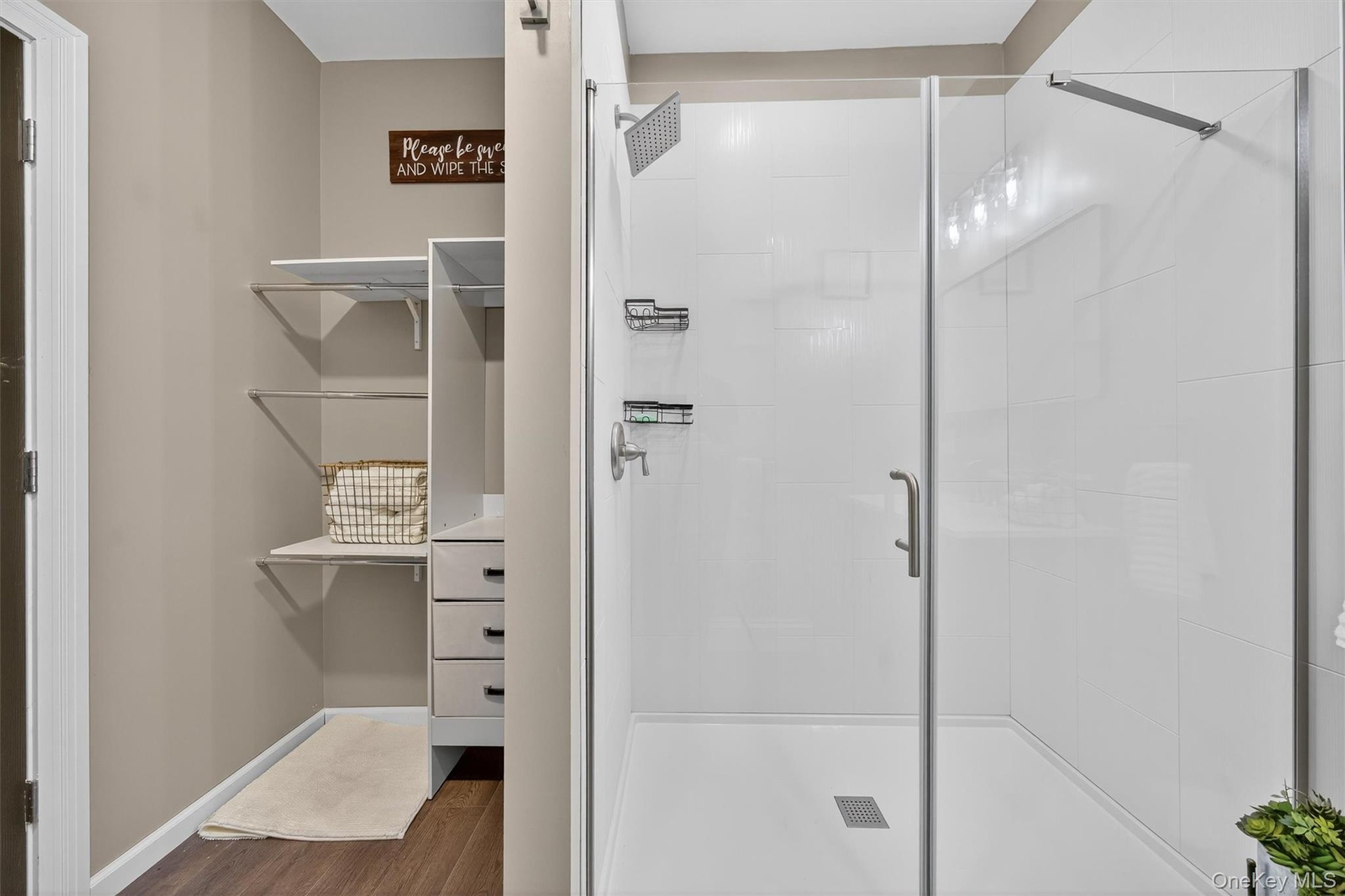 - Bathroom featuring a shower stall, dark wood-type flooring, and a spacious closet