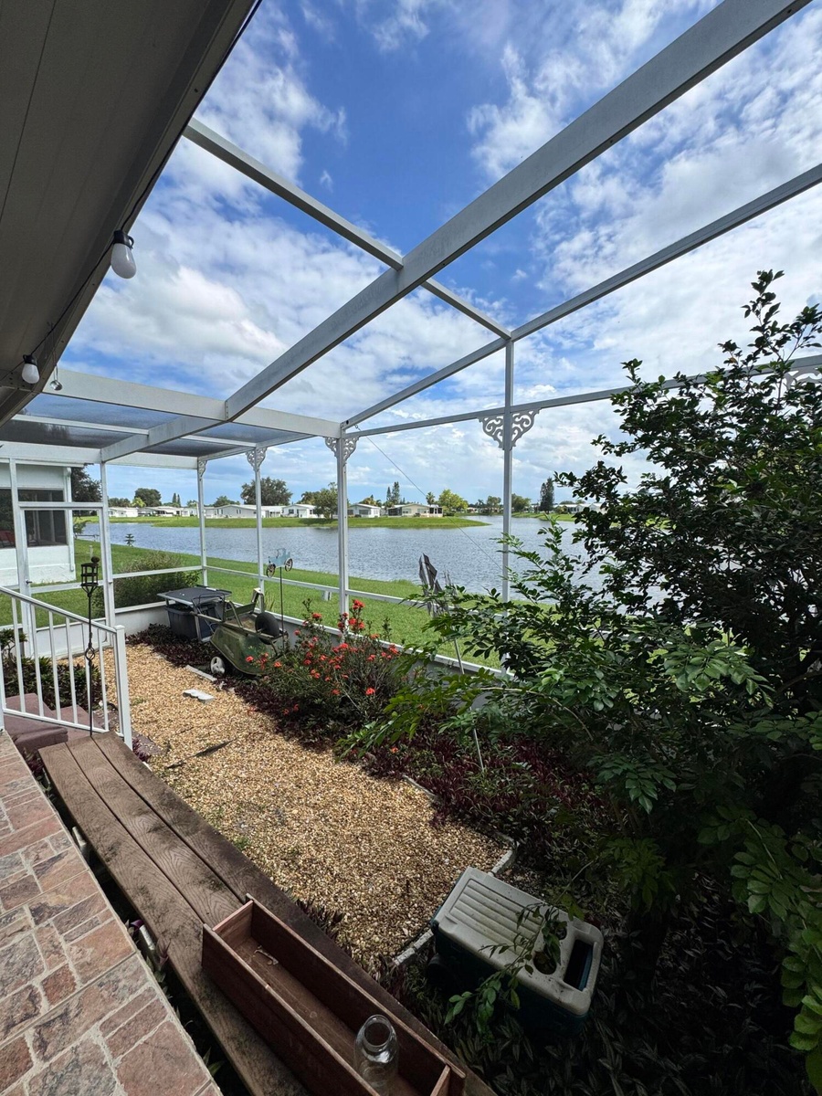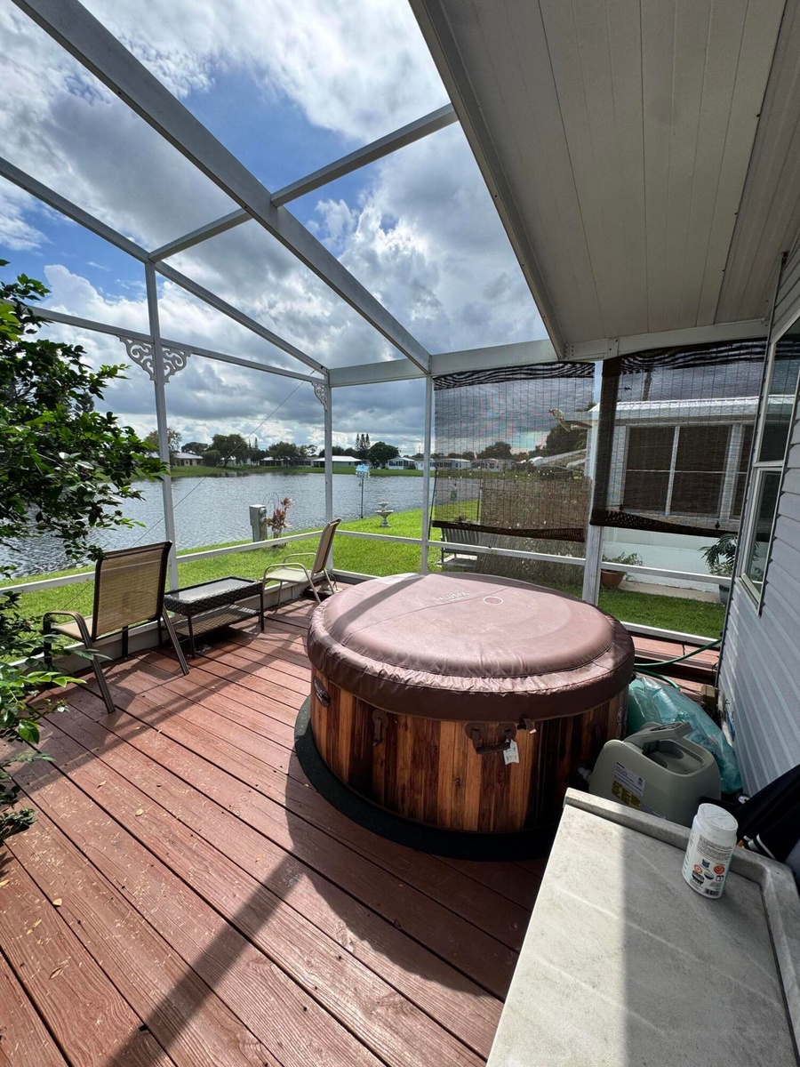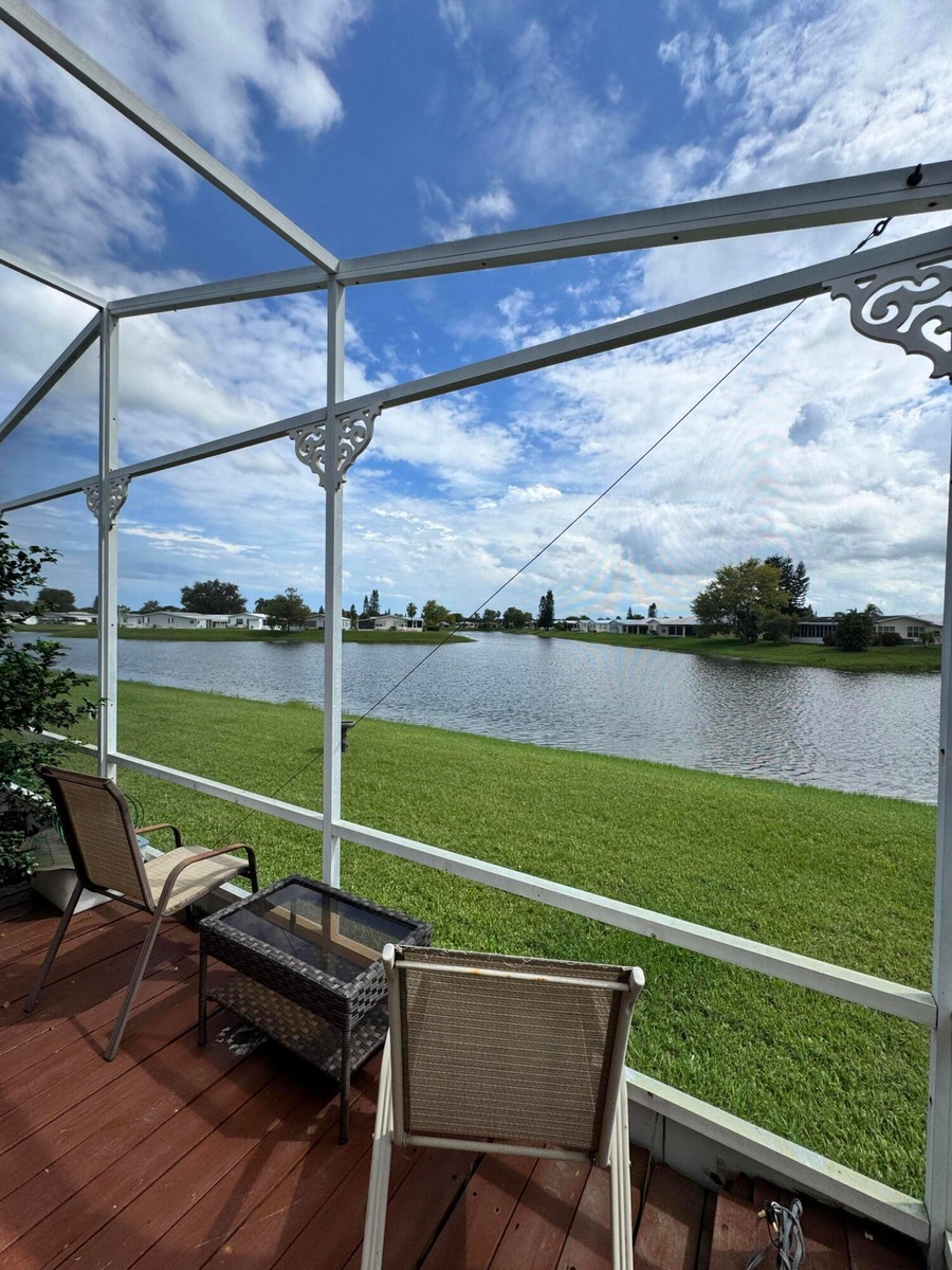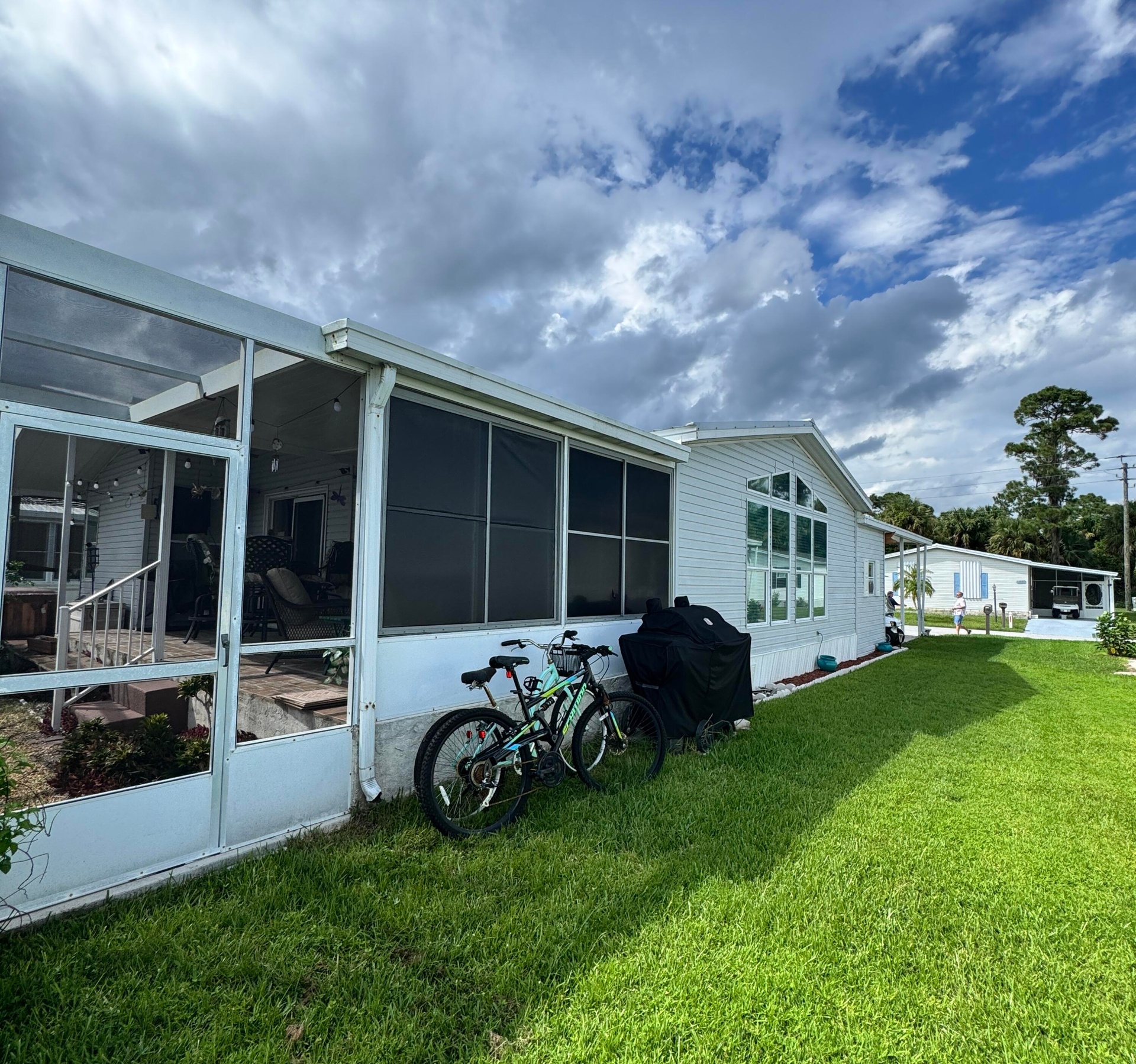 This lovely triple-wide 2-bedroom 2-bath home is in the desirable 55+Spanish Lakes Fairways community. Home is a lakeview home with a large screened-in patio overlooking the lake with a south exposure. Perfect for morning coffee or evening cocktails. This home boasts a family room as well as a living room with built-in shelves for added storage. Formal dining room. Perfect for entertaining or weekend company. Home is being sold unfurnished. Metal roof (2020), A/C (2018), Plumbing has been redone in 2024, New dryer vent (2024), New vapor barrier. New 50-gallon water heater 2024. Lawn care and trash removal are included in the lot rent. The community features two pools, tennis, pickleball, bocceball, shuffleboard, an 18-hole golf course, and much more. MUST SE