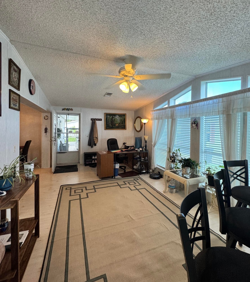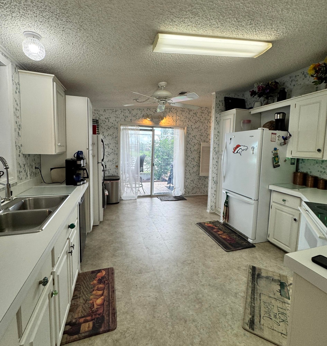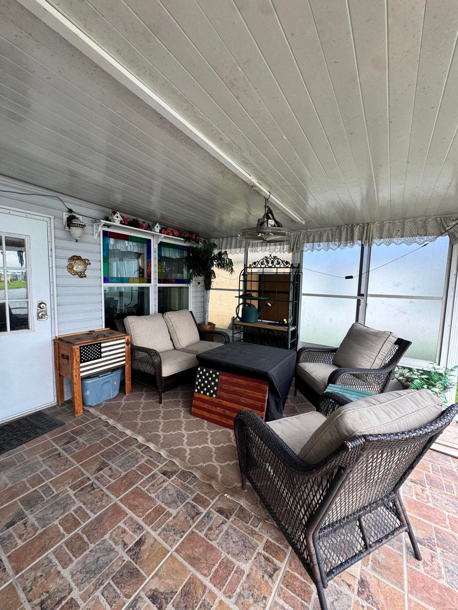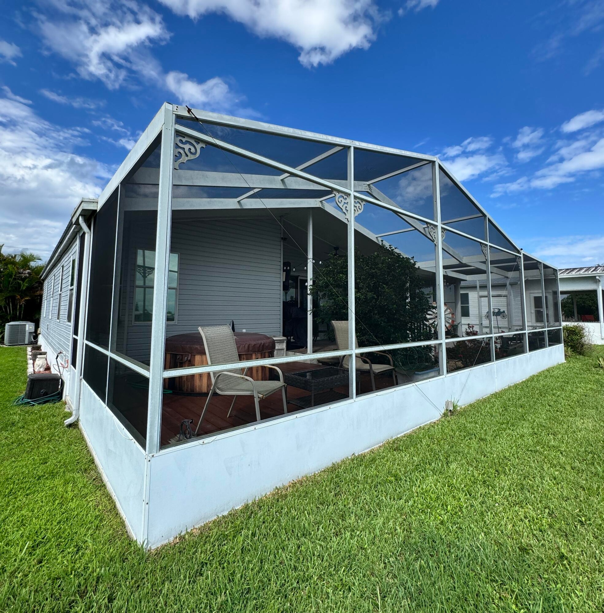 This lovely triple-wide 2-bedroom 2-bath home is in the desirable 55+Spanish Lakes Fairways community. Home is a lakeview home with a large screened-in patio overlooking the lake with a south exposure. Perfect for morning coffee or evening cocktails. This home boasts a family room as well as a living room with built-in shelves for added storage. Formal dining room. Perfect for entertaining or weekend company. Home is being sold unfurnished. Metal roof (2020), A/C (2018), Plumbing has been redone in 2024, New dryer vent (2024), New vapor barrier. New 50-gallon water heater 2024. Lawn care and trash removal are included in the lot rent. The community features two pools, tennis, pickleball, bocceball, shuffleboard, an 18-hole golf course, and much more. MUST SE