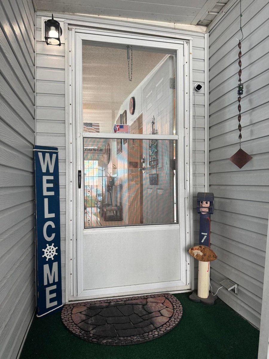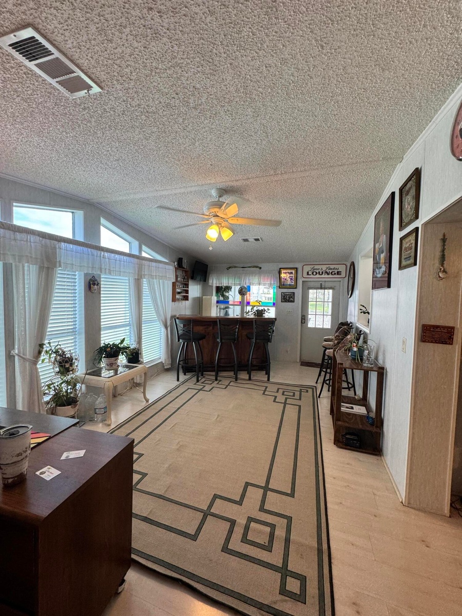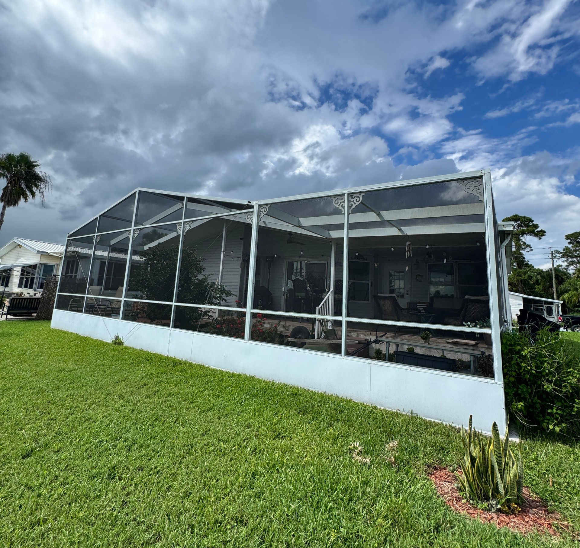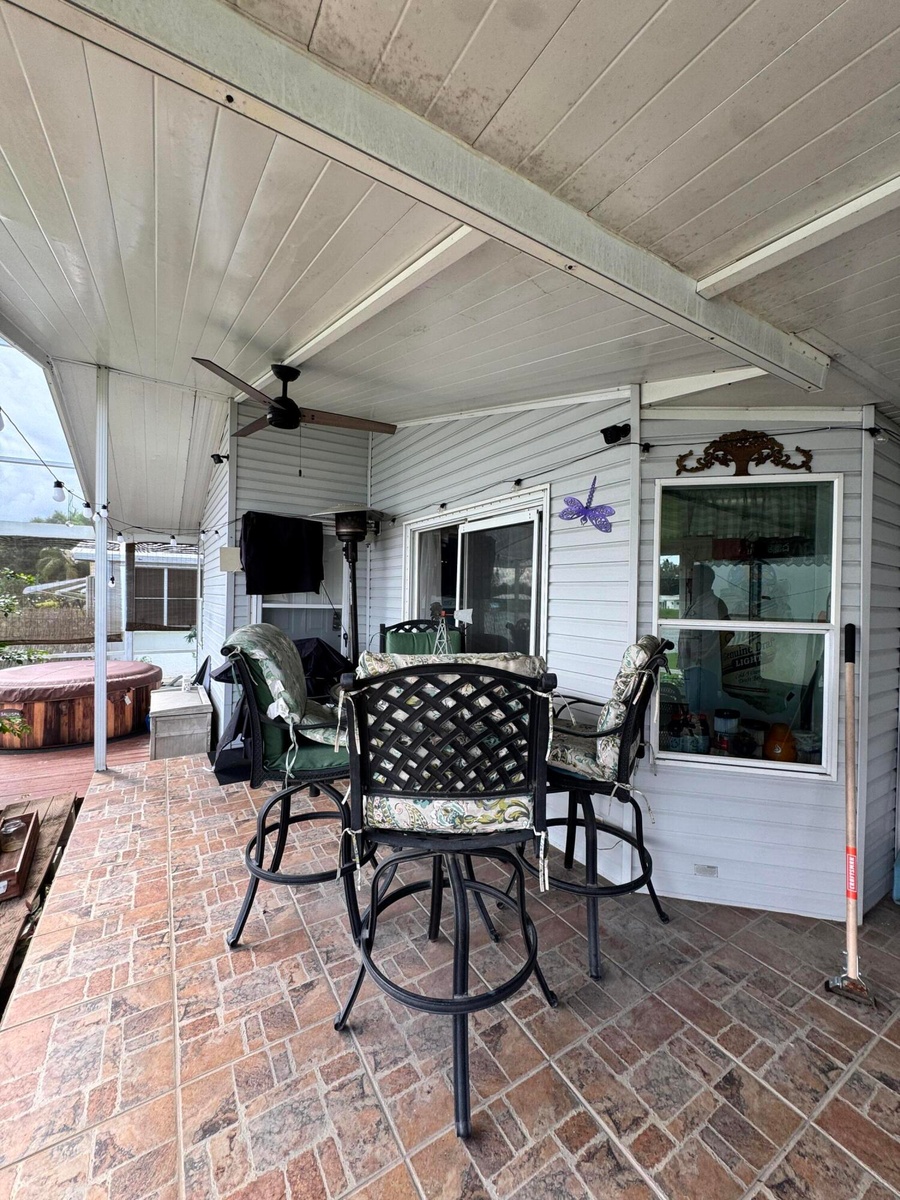 This lovely triple-wide 2-bedroom 2-bath home is in the desirable 55+Spanish Lakes Fairways community. Home is a lakeview home with a large screened-in patio overlooking the lake with a south exposure. Perfect for morning coffee or evening cocktails. This home boasts a family room as well as a living room with built-in shelves for added storage. Formal dining room. Perfect for entertaining or weekend company. Home is being sold unfurnished. Metal roof (2020), A/C (2018), Plumbing has been redone in 2024, New dryer vent (2024), New vapor barrier. New 50-gallon water heater 2024. Lawn care and trash removal are included in the lot rent. The community features two pools, tennis, pickleball, bocceball, shuffleboard, an 18-hole golf course, and much more. MUST SE