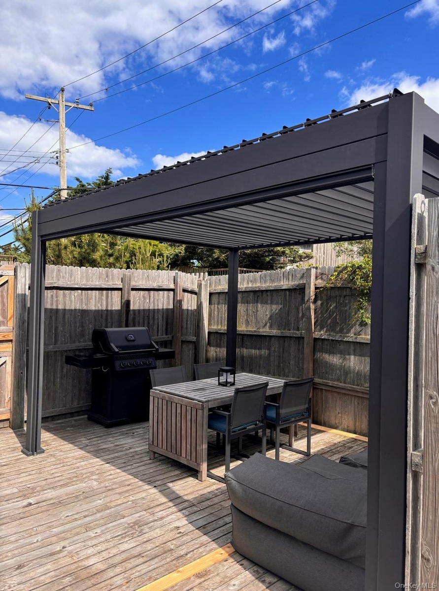 - Wooden terrace with outdoor dining space and grilling area