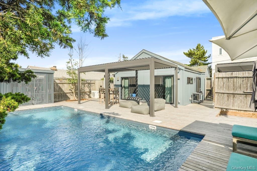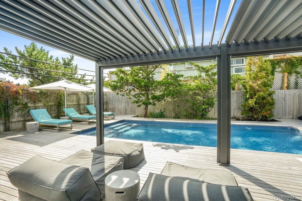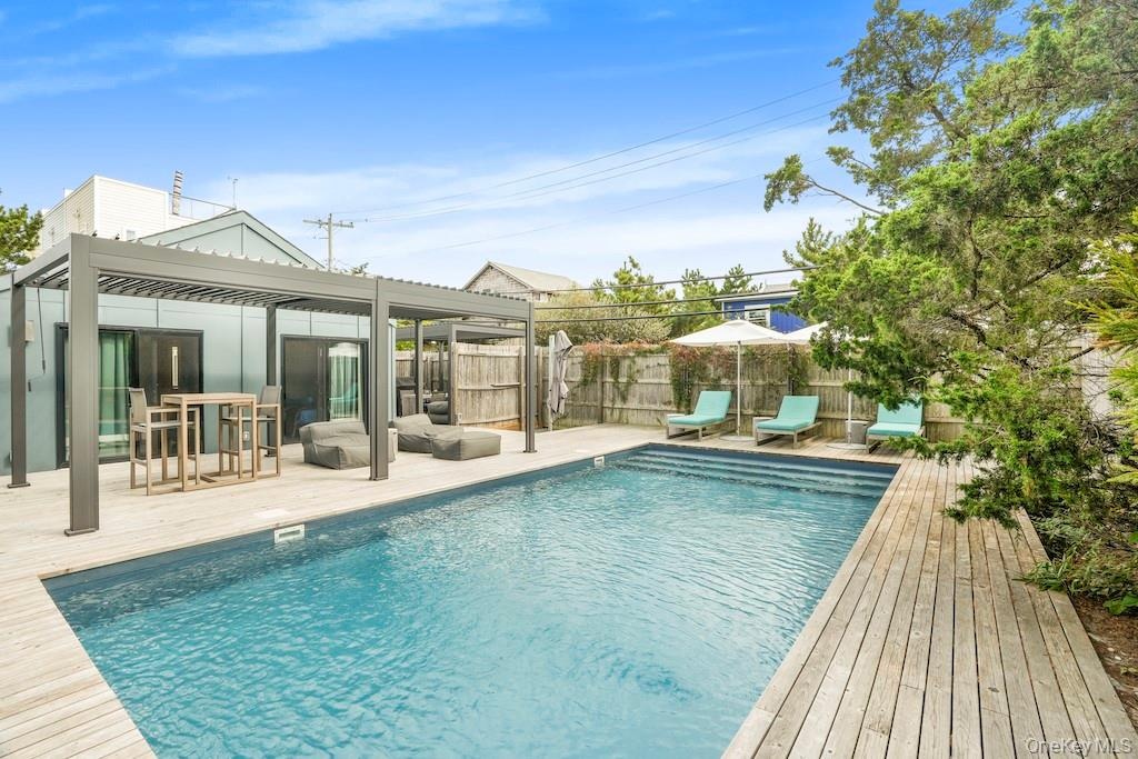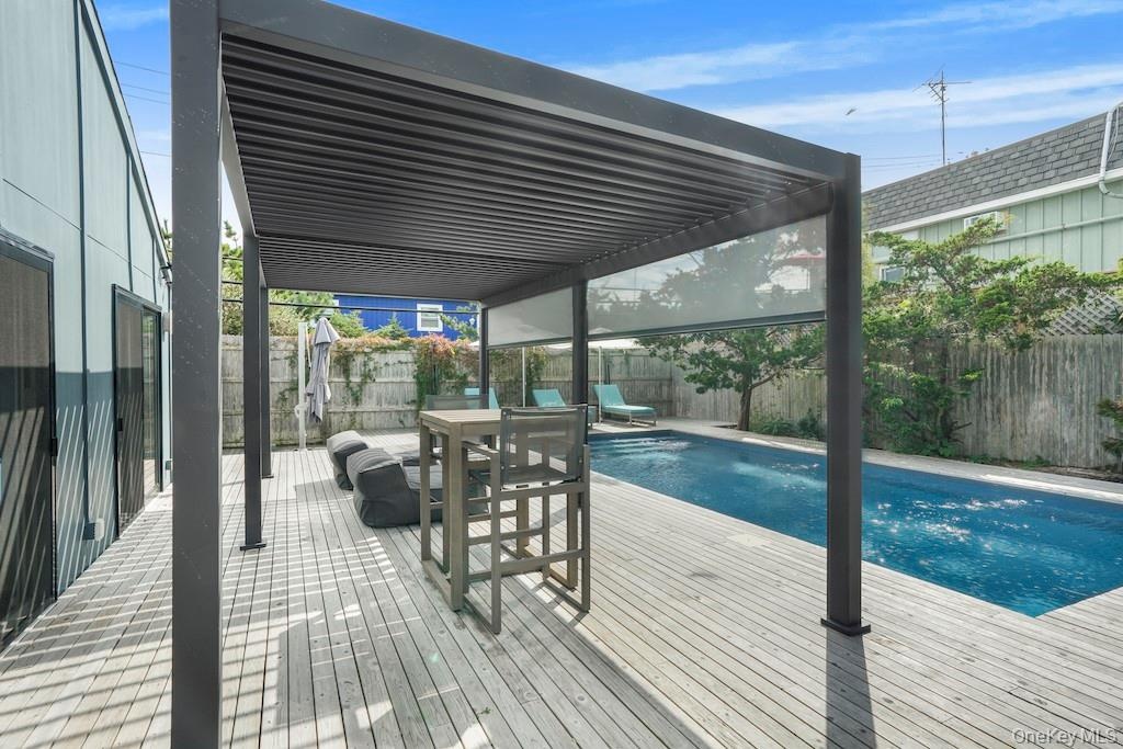 - View of swimming pool with a wooden deck and a pergola