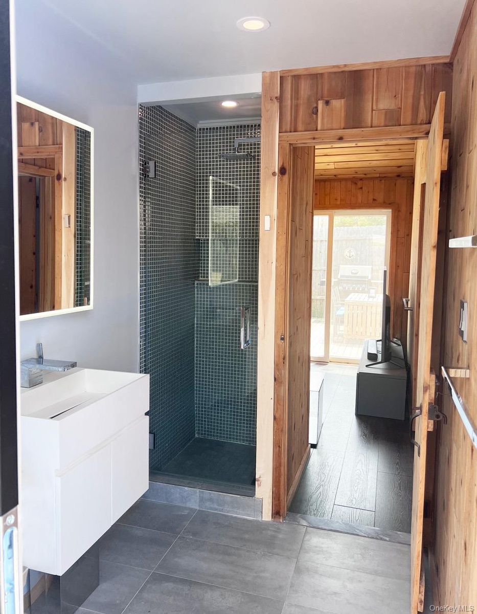 - Bathroom with vanity, a shower stall, wood walls, and recessed lighting