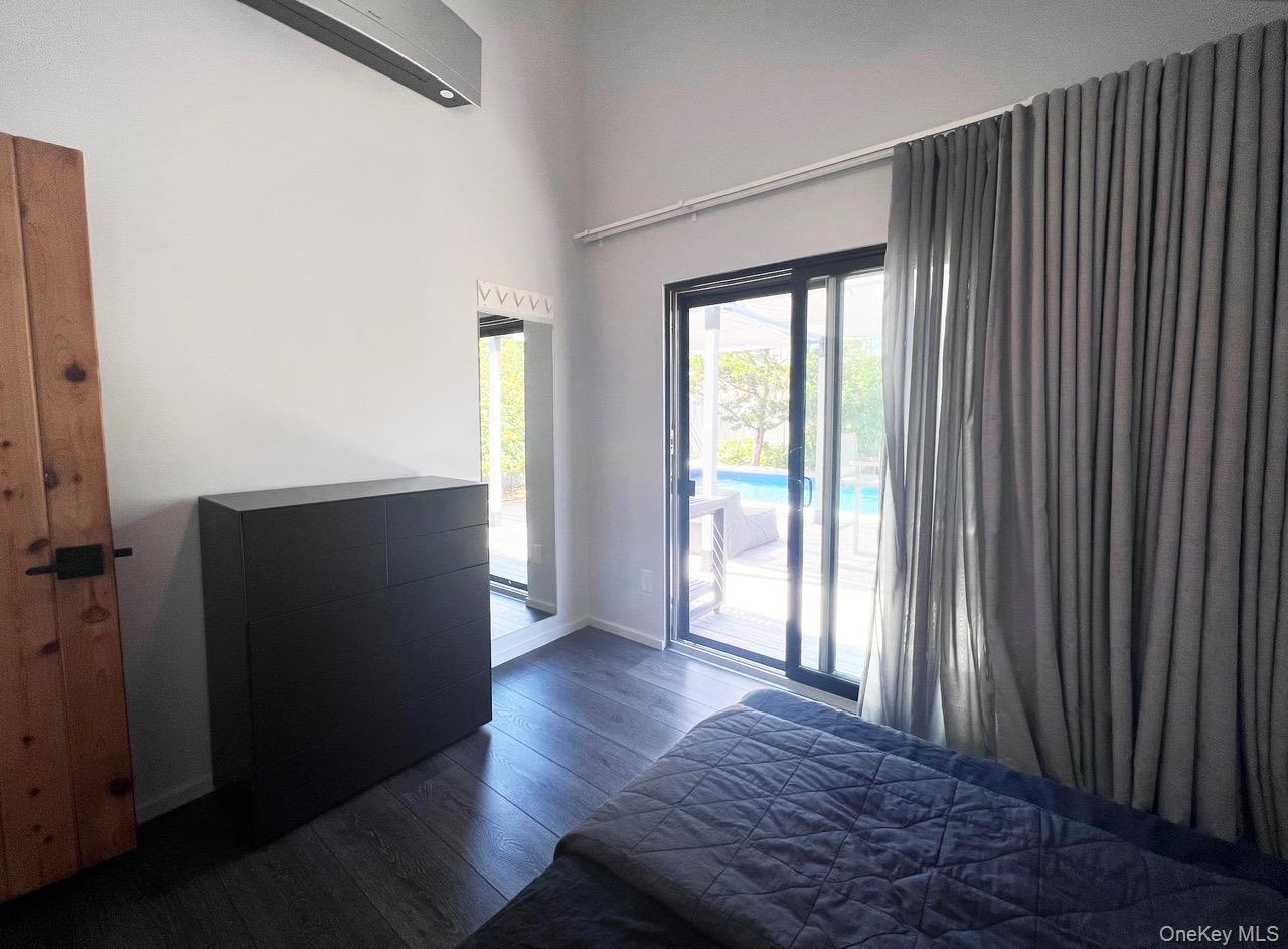 - Bedroom with dark wood-type flooring, access to outside, a high ceiling, and a wall mounted AC