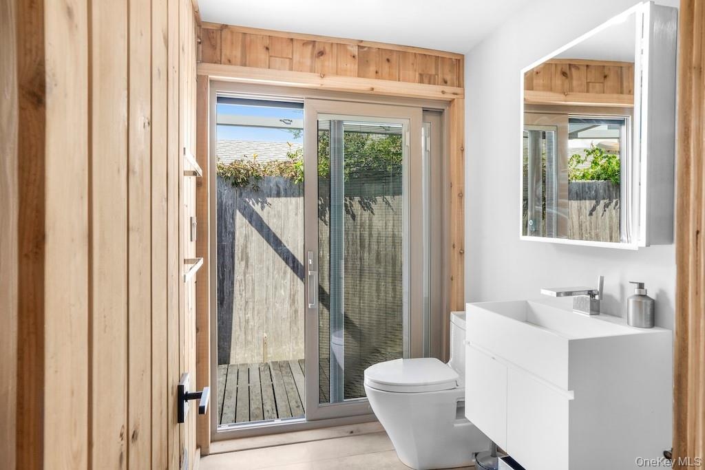- Bathroom featuring vanity, plenty of natural light, and wood walls