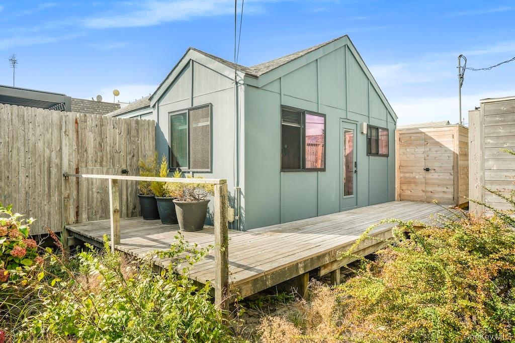 - Back of property with a wooden deck and board and batten siding