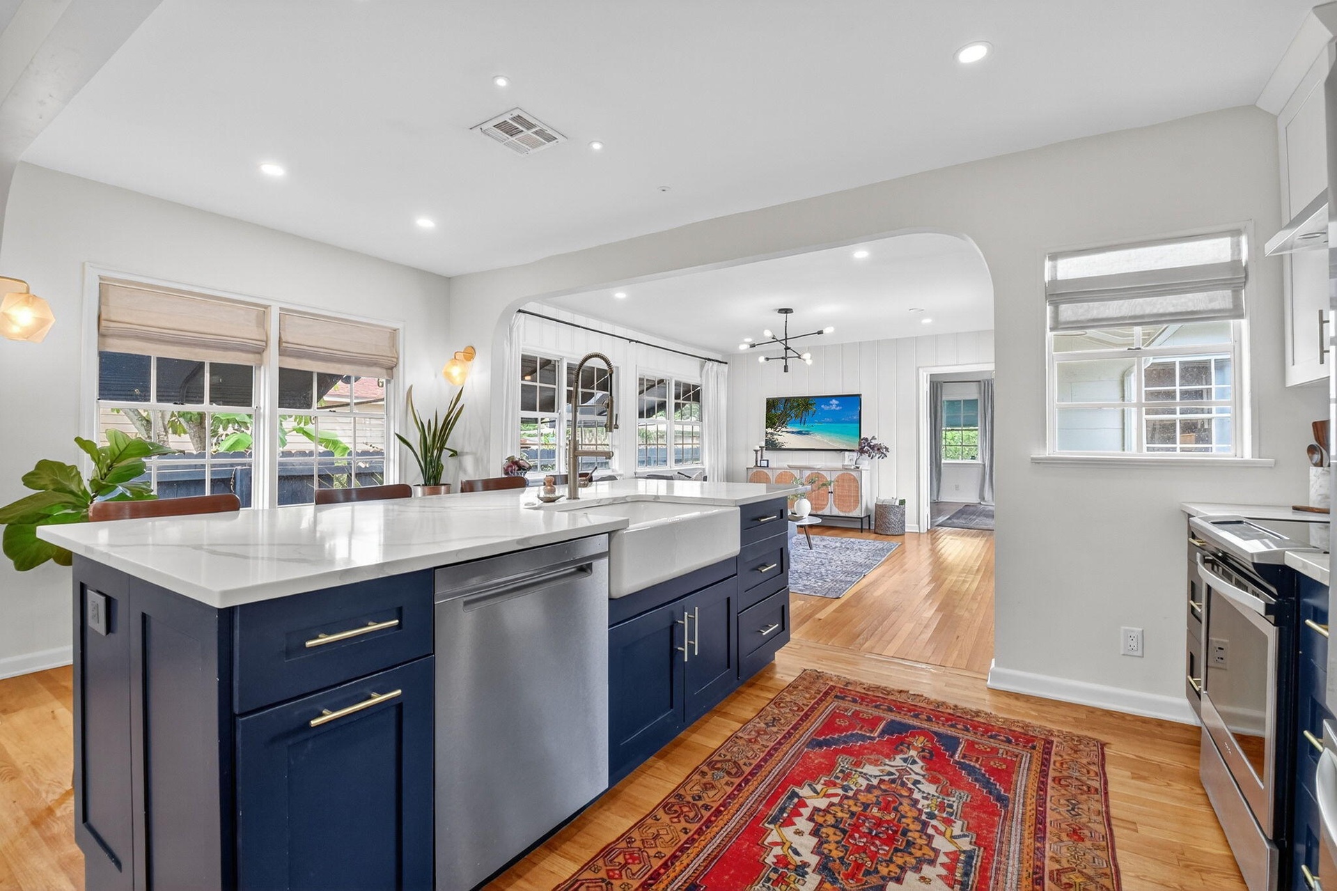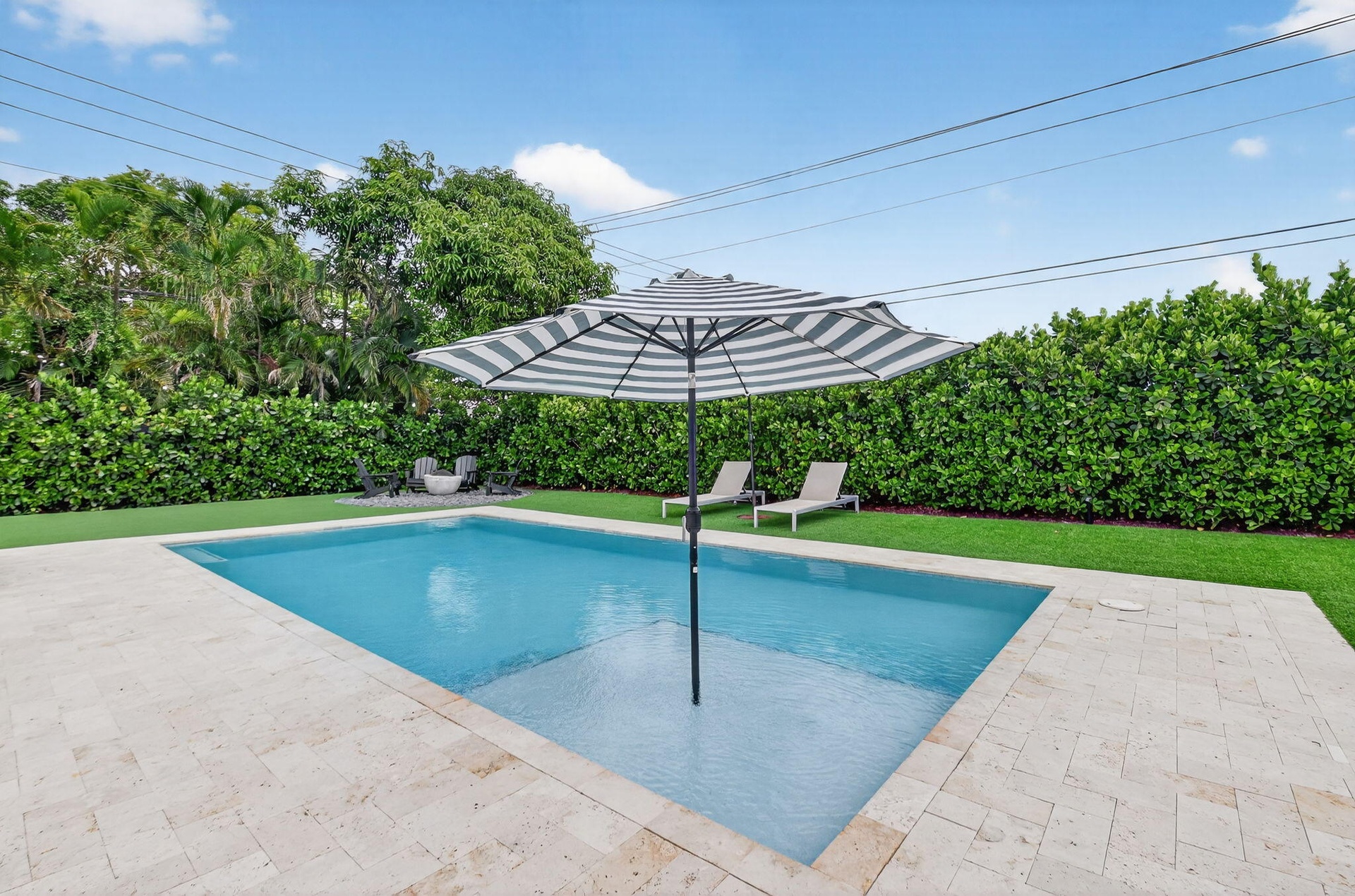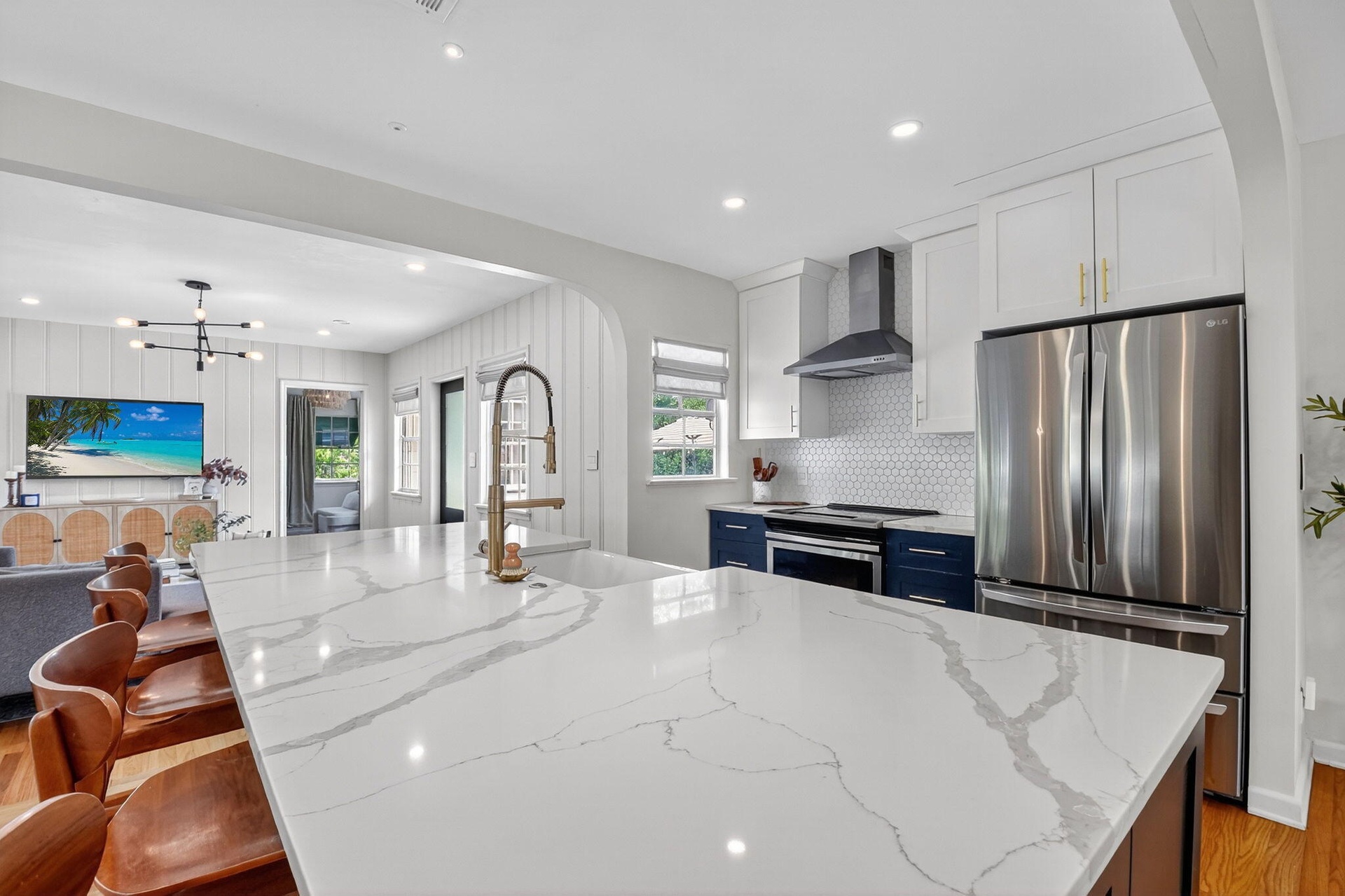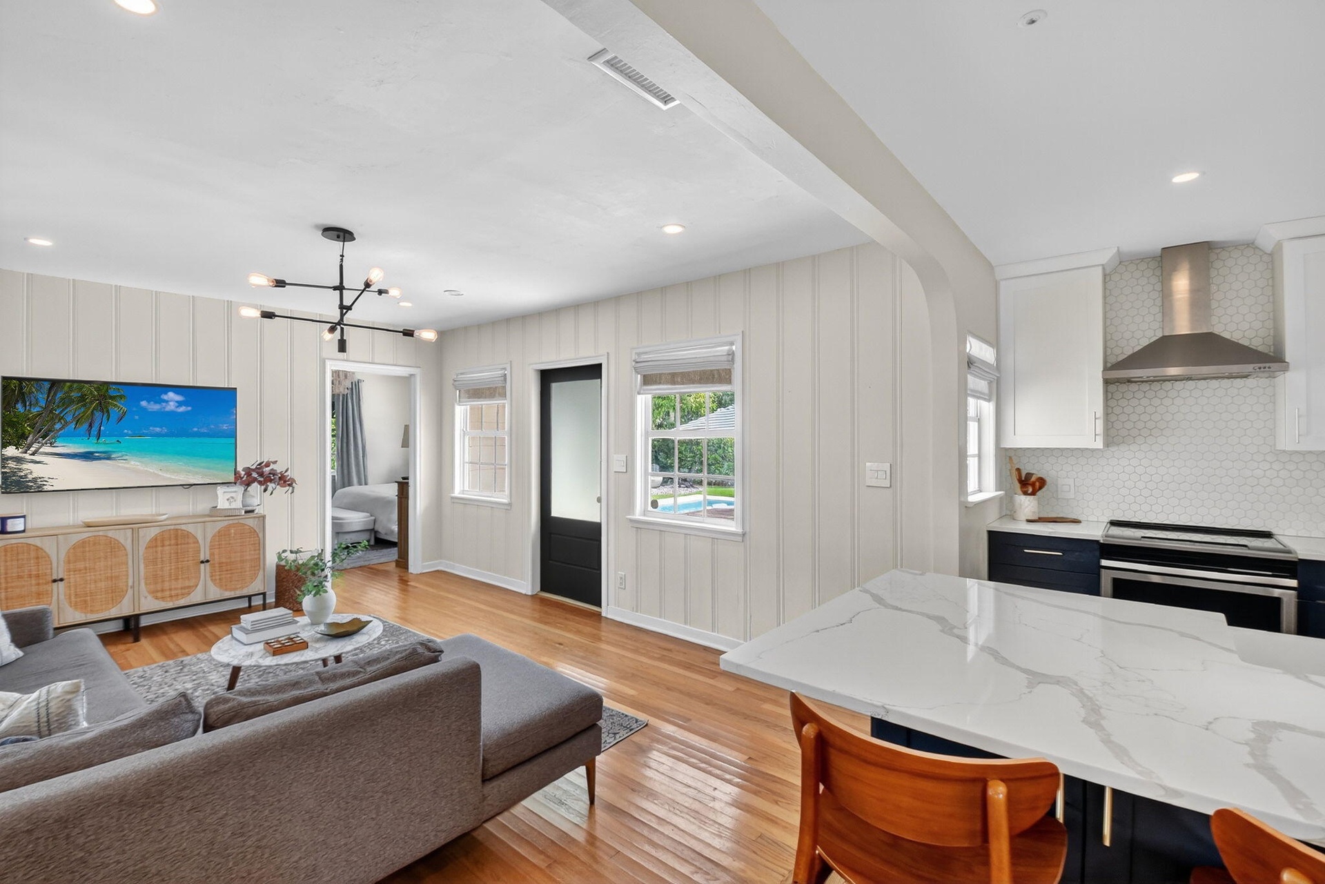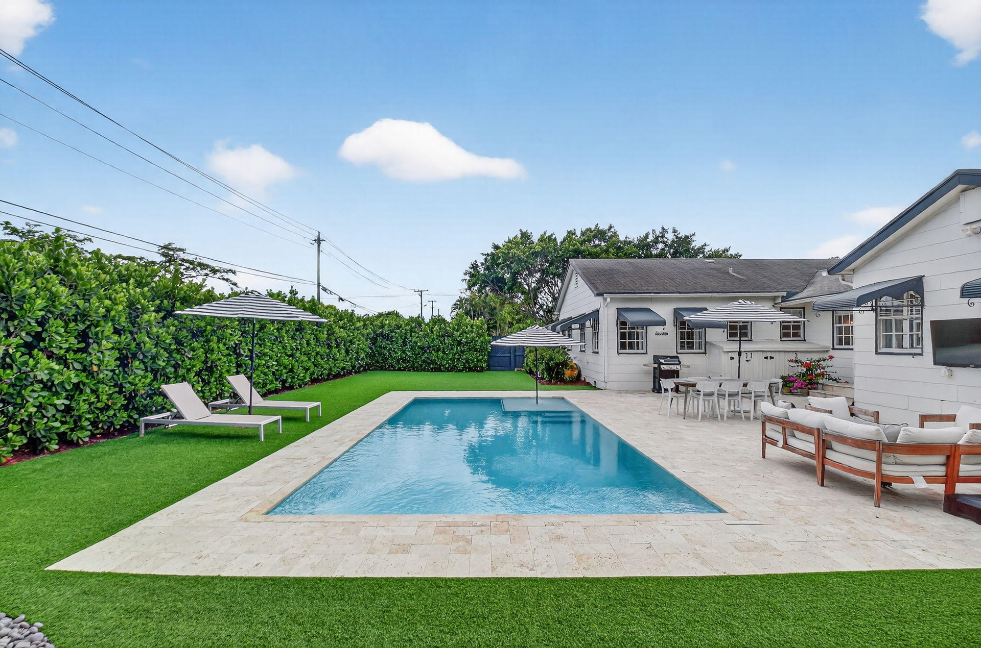 A rare blend of charm, space, and style, this beautifully furnished annual rental is located in one of West Palm Beach's most desirable neighborhoods. Just minutes from downtown but tucked away on a quiet, tree-lined street, the home offers the kind of indoor-outdoor living experience that's nearly impossible to find in the heart of the city. Inside, you'll find a bright and airy floor plan centered around a stunning, fully renovated kitchen. The oversized island, sleek quartz counters, custom cabinetry & high-end finishes make it both functional & visually striking, perfect for everyday living or entertaining. Both bathrooms have been tastefully updated with a clean, modern aesthetic that complements the home's timeless charm. But what truly sets this home apart is the expansive backyard