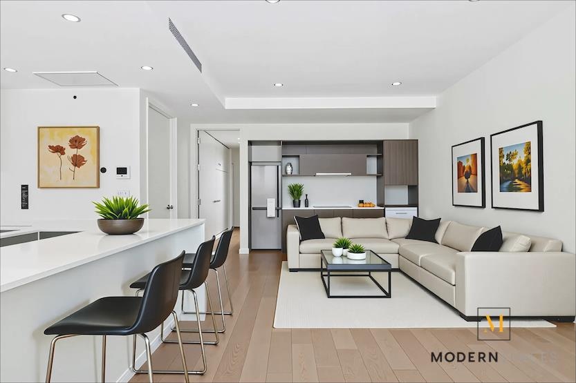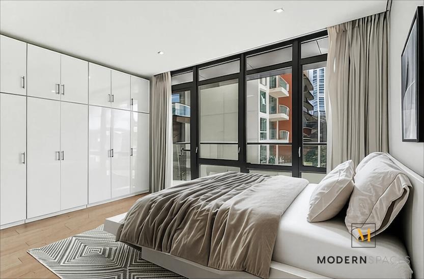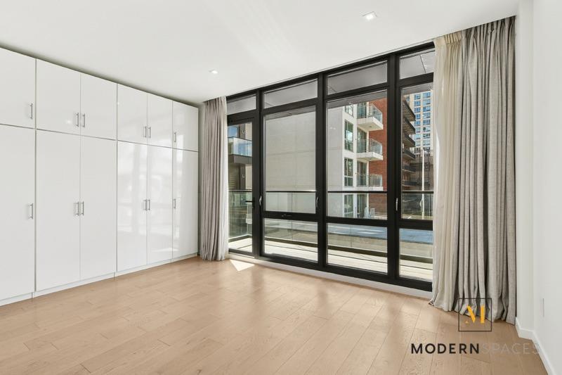 The primary bedroom easily accommodates a king-sized bed and opens onto a spacious balcony. Floor-to-ceiling windows and hardwood floors throughout create a bright, sophisticated, contemporary ambiance.
