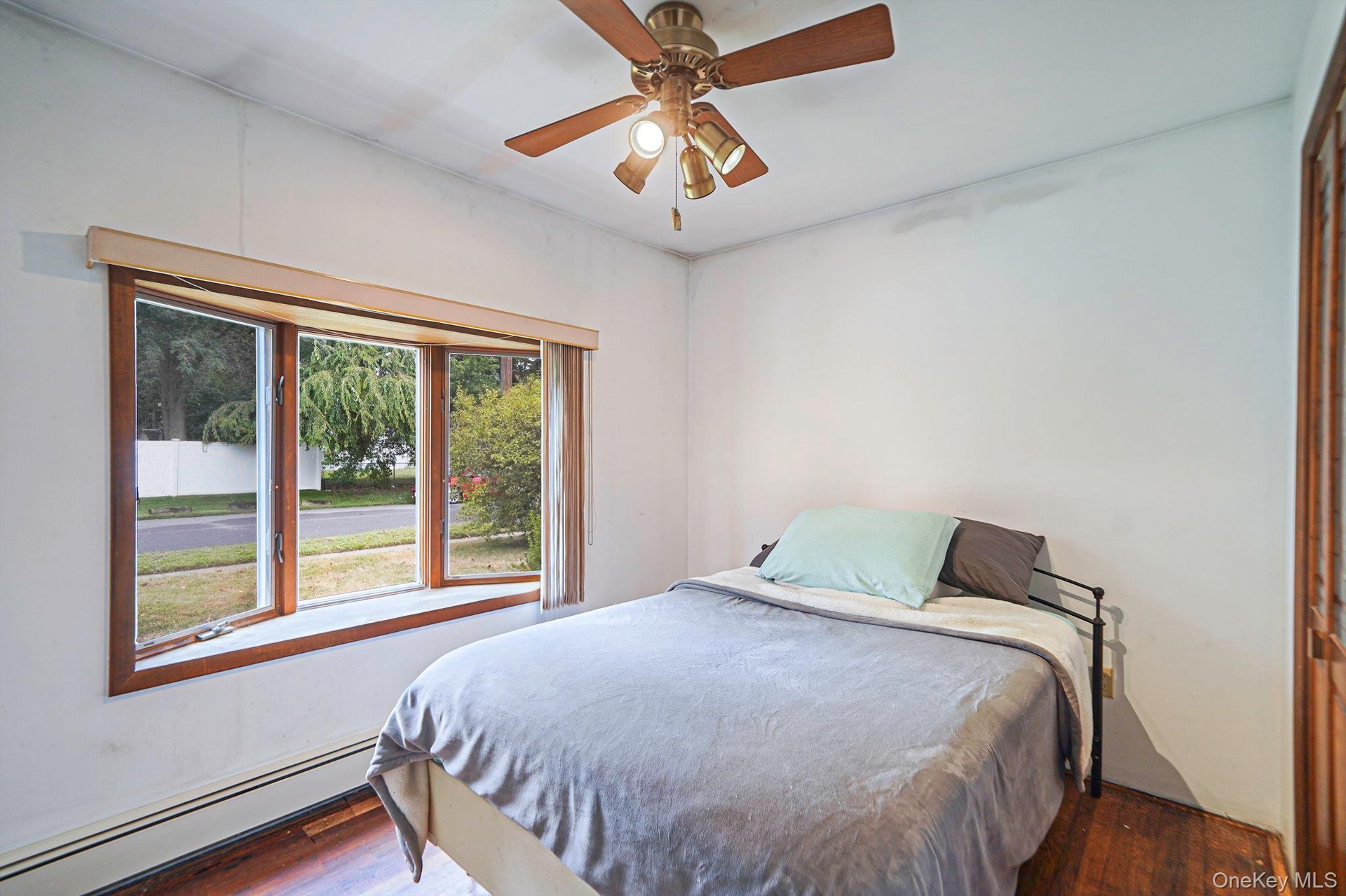 - Bedroom featuring a baseboard heating unit, dark wood-style floors, and a ceiling fan