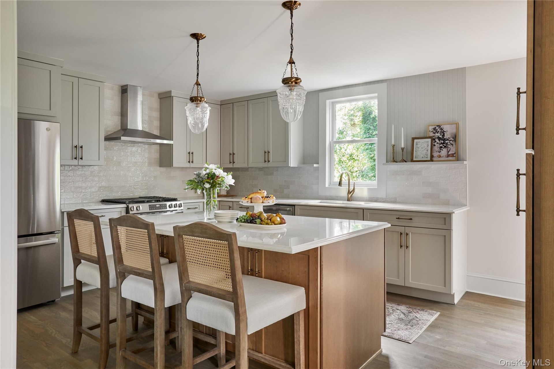 As you enter the circular foyer, the stunning original oak paneling and staircase immediately takes you to a time gone by. The main floor showcases a stunning designer kitchen with beautiful white oak floors and MSI quartz countertops, complemented by an impeccable Portmore tile backsplash. The culinary centerpiece features brand-new stainless steel appliances, including a striking double-sided island perfect for preparation and casual dining. Thoughtful details like recessed lighting and custom cabinetry demonstrate meticulous attention to both form and function.