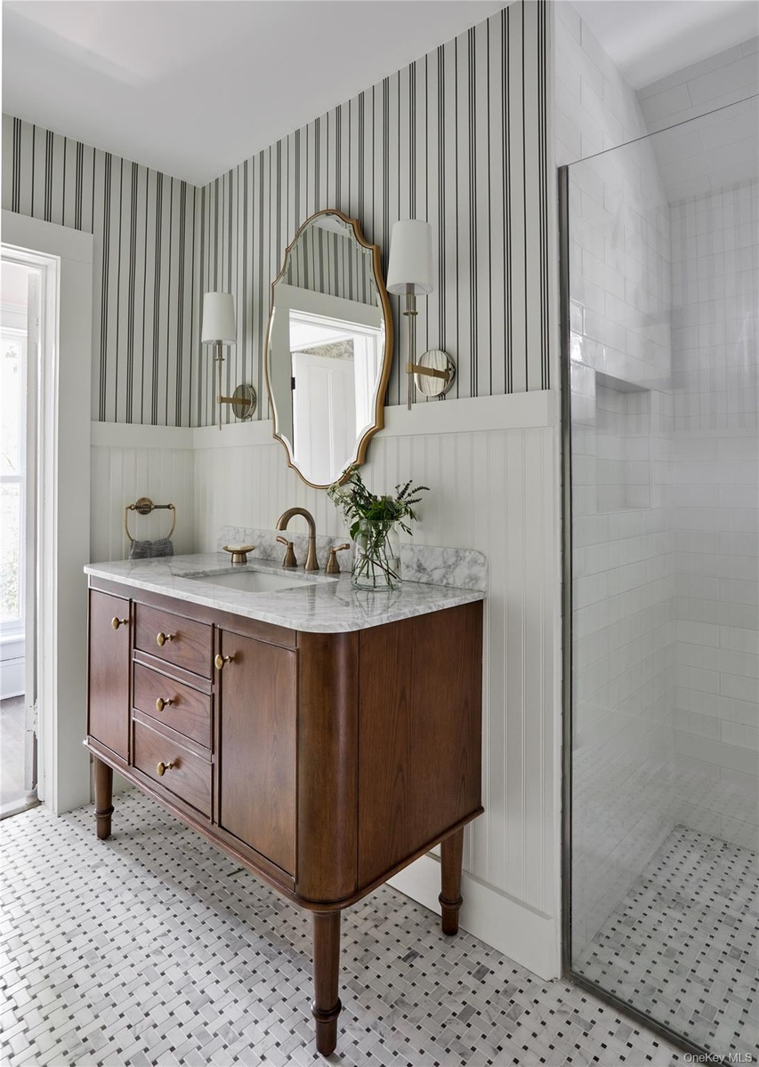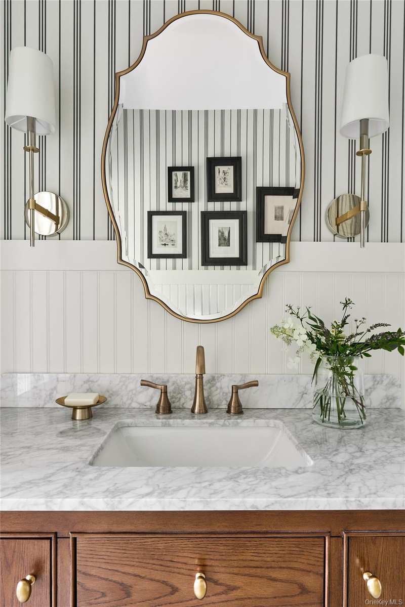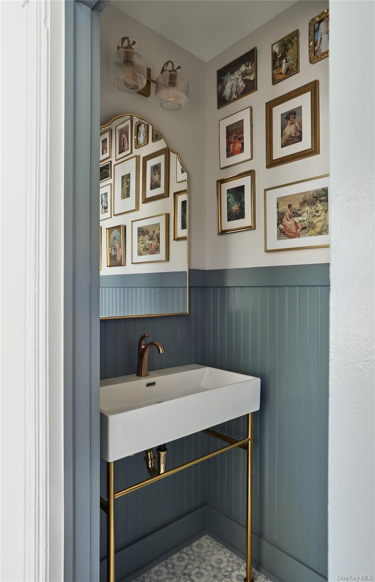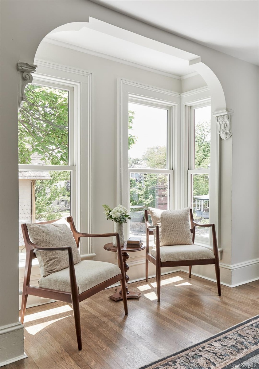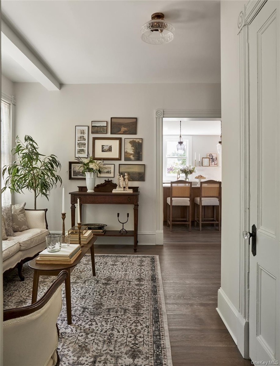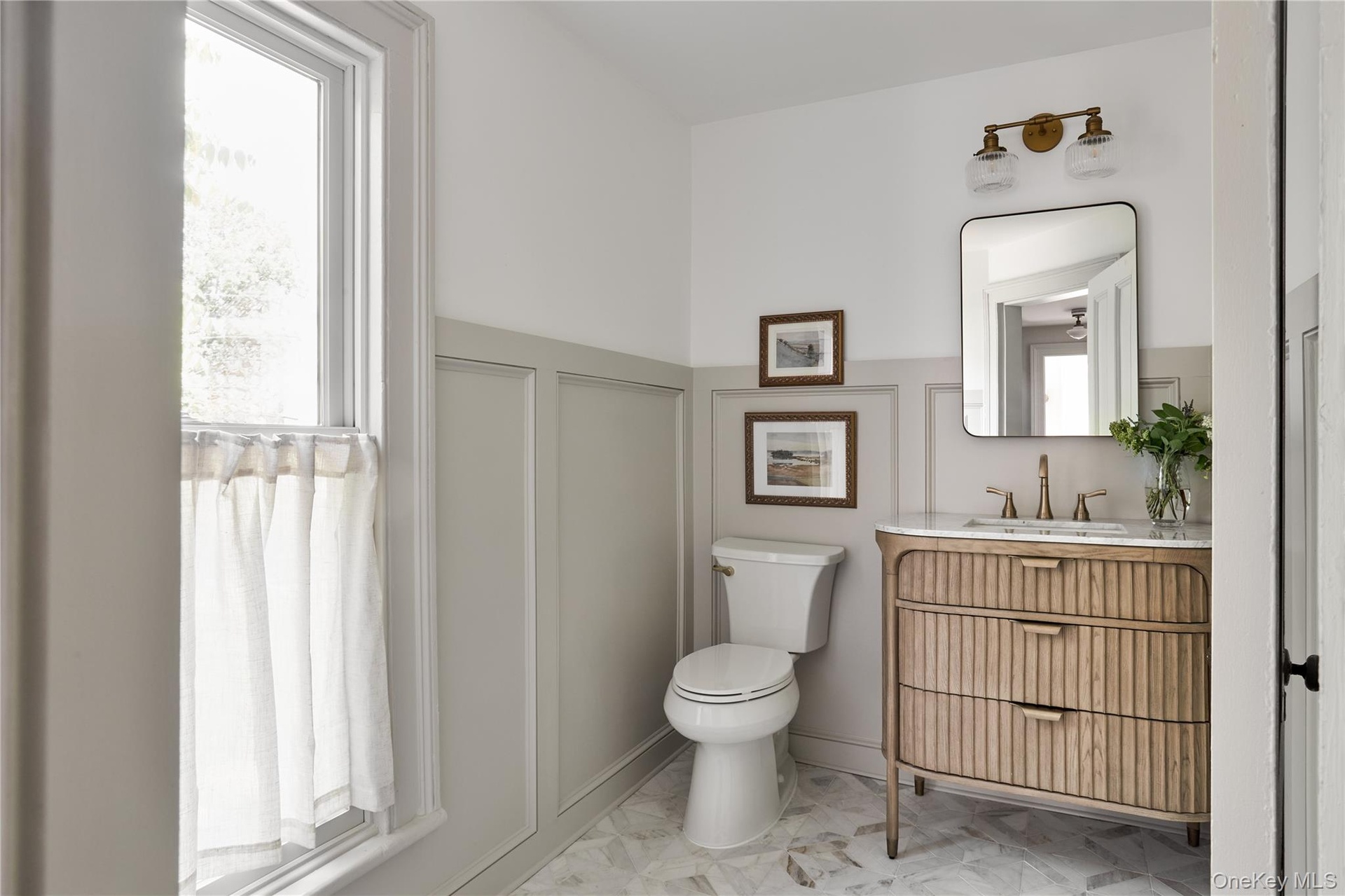 The dining room serves as the perfect connector between kitchen, living room and family room creating seamless flow for entertaining. The dining room and adjacent living room captivate with their original parquetry white oak floors and wide windows that flood the space with natural light. A charming powder room featuring historical blue beadboard wainscoting adds upscale functionality.