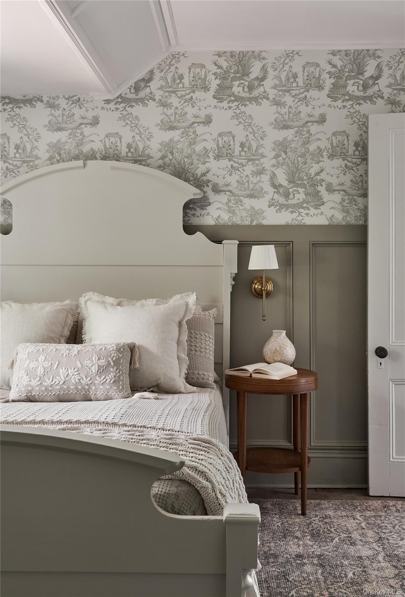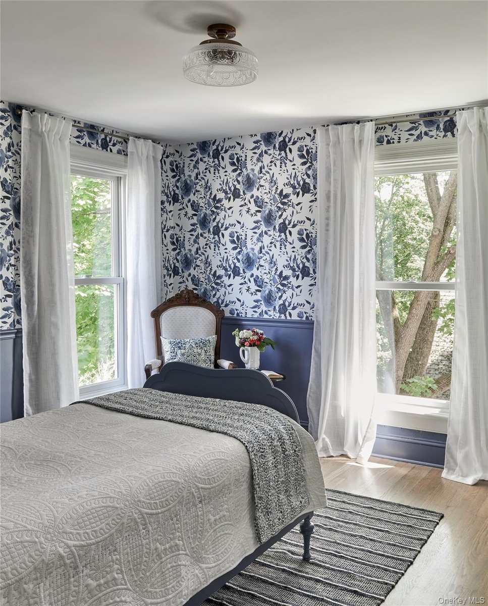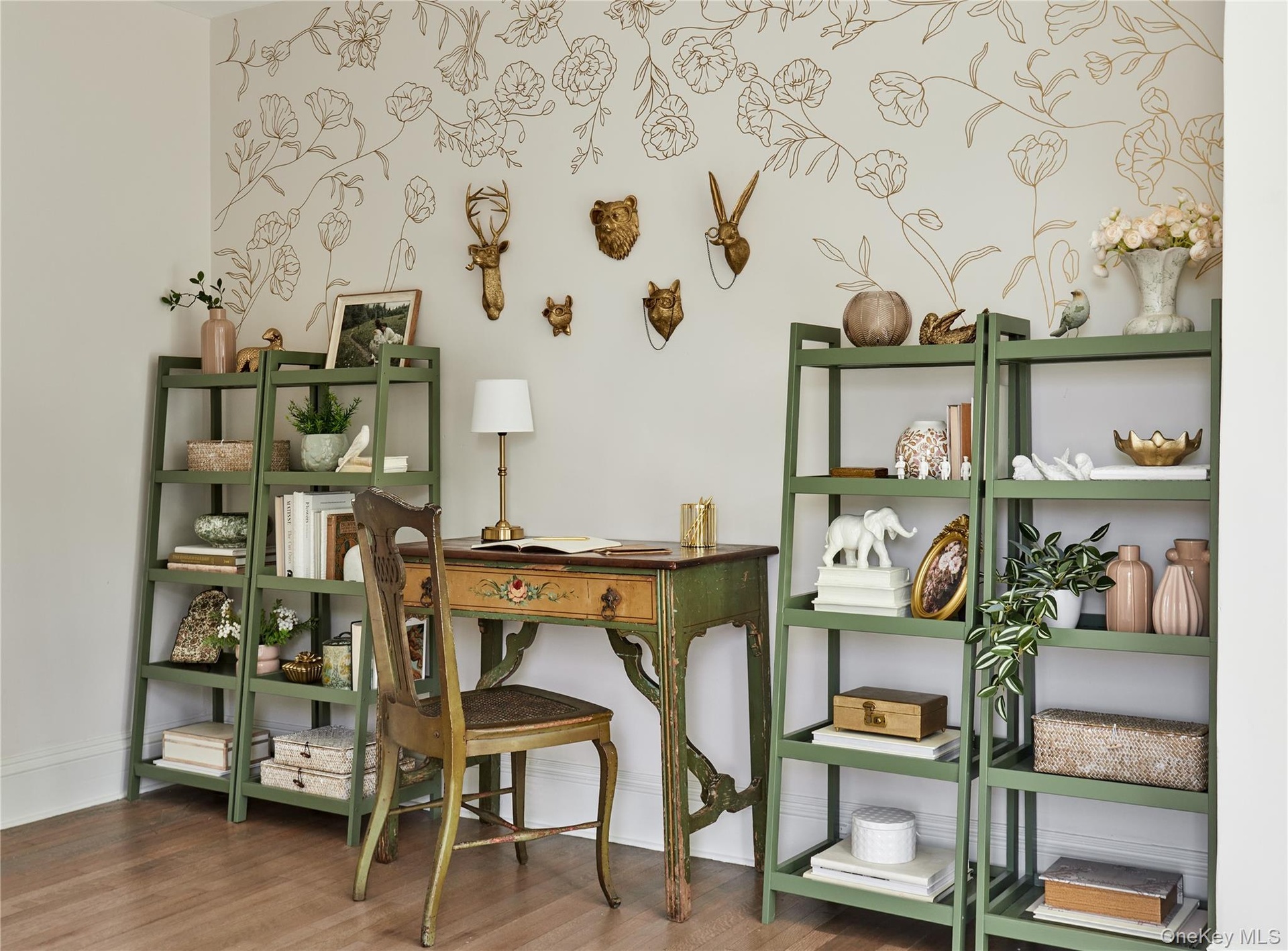 The second floor boasts beautiful original wood floors and houses the luxurious main bedroom with a large arched-top alcove that creates a light-filled sanctuary, and generous walk-in closet space. The main bathroom serves as a spa-like retreat with its wooden vanity topped with marble countertop housing two undermount sinks, a spacious walk-in shower with white herringbone ceramic tile walls, and white marble flooring. The piece de resistance is the stunning original white clawfoot bathtub that perfectly bridges historic charm with modern luxury. Another peaceful bedroom features sage green board and batten with toile wallpaper. The home's distinctive turret houses a bright office space, offering the perfect retreat for work or contemplation.